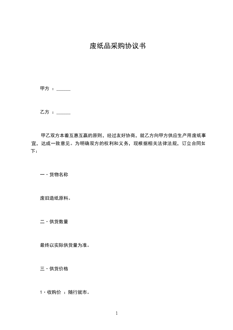 甲乙双方本着互惠互赢的原则,经过友好协商,就乙方向甲方供应生产用废纸事宜,达成一致意见。为明确双方的权利和义务,现根据相关法律法规,订立合同如下 :