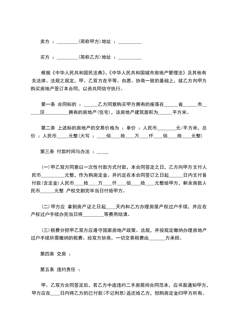 第二条 上述标的房地产的交易价格为 :单价 :人民币________元/平方米,总价 :人民币_____元整(大写 :____佰____拾____万____仟____佰____拾____元整)
