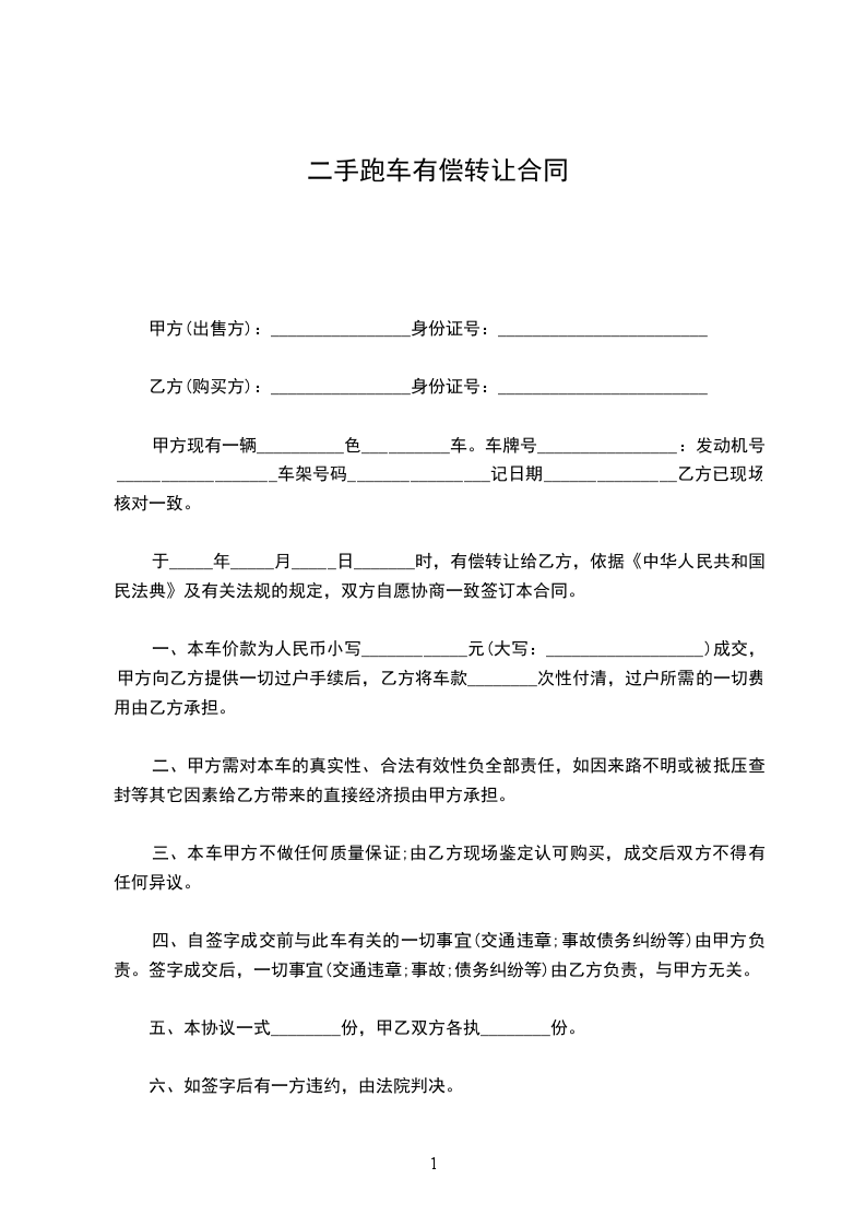 甲方现有一辆______色______车。车牌号:________发动机号:______________车架号码:________________记日期:___________乙方已现场核对一致。于_____年_____月_____日_______时,有偿转让给乙方,依据《中华人民共和国民法典》及有关法规的规定,双方自愿协商一致签订本合同。