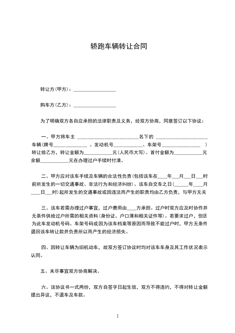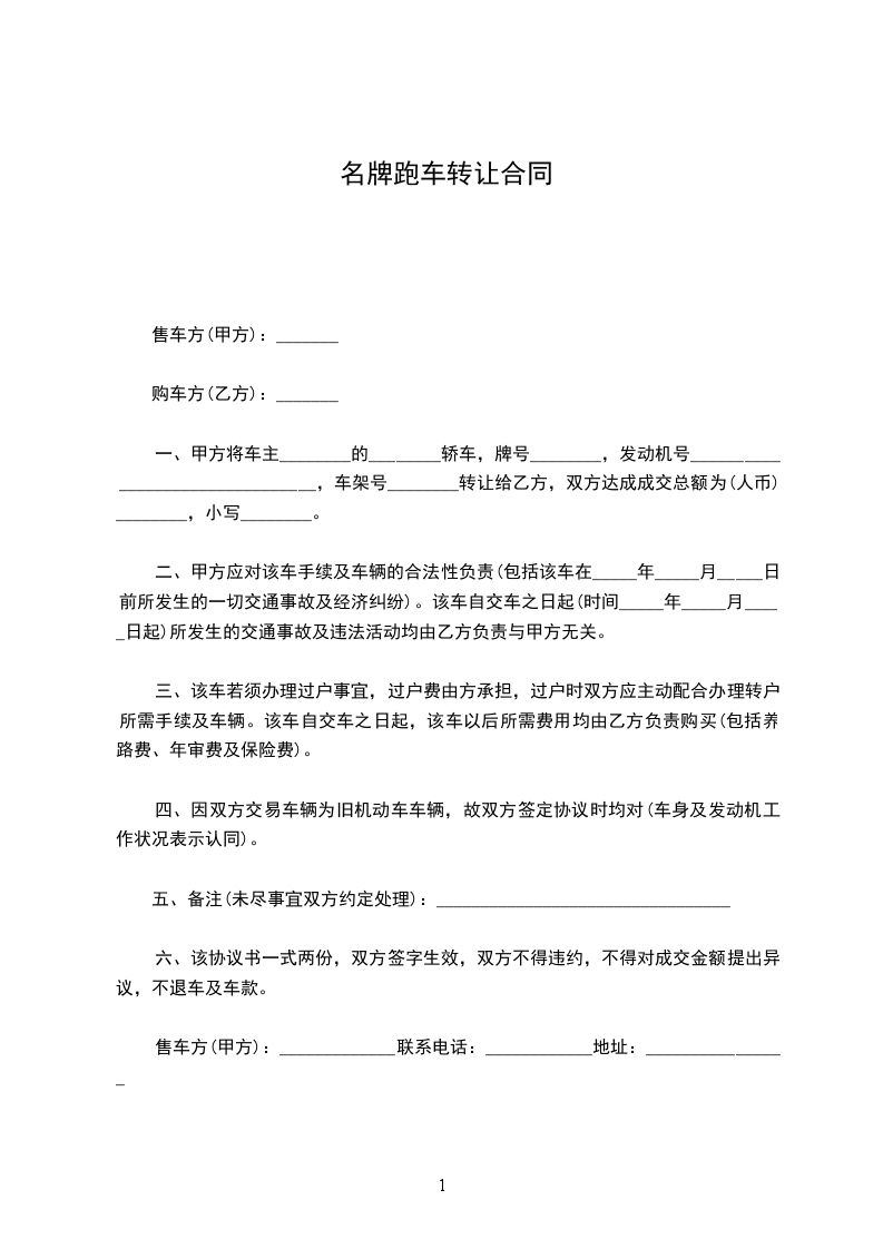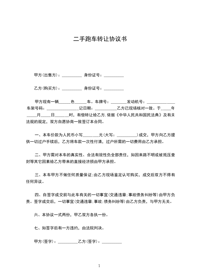 一、本车价款为人民币小写________元(大写:__________)成交,甲方向乙方提供一切过户手续后,乙方将车款一次性付清,过户所需的一切费用由乙方承担。