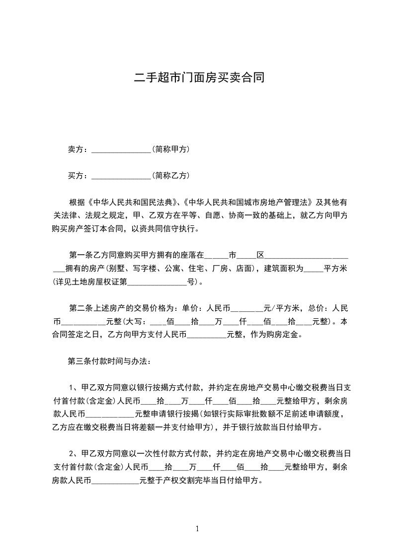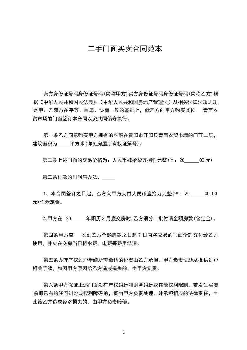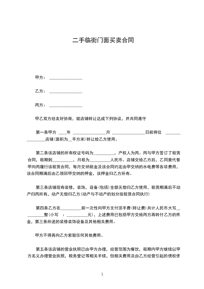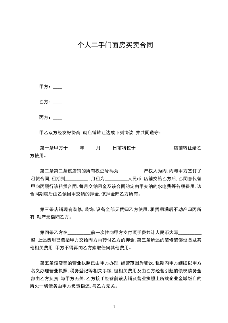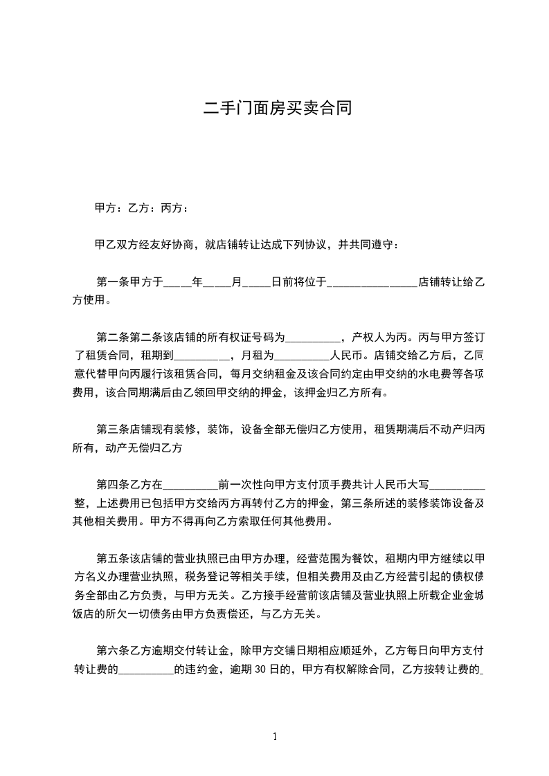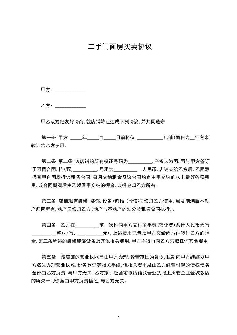 第一条 甲方 _____年_____月_____日前将位 ___________店铺(面积为__平方米)转让给乙方使用。