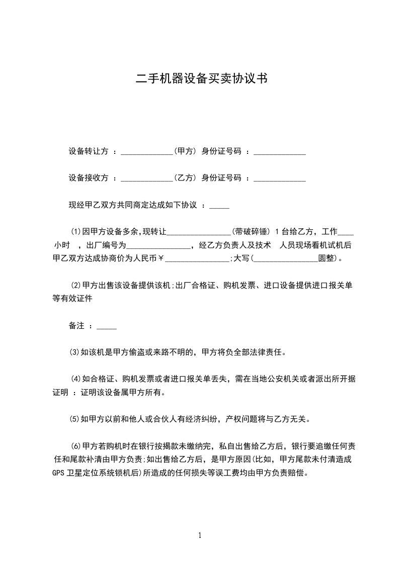 (1)因甲方设备多余,现转让________________(带破碎锤)1台给乙方,工作____小时 ,出厂编号为________________,经乙方负责人及技术 人员现场看机试机后,甲乙双方达成协商价为人民币¥________________;大写(________________圆整)。