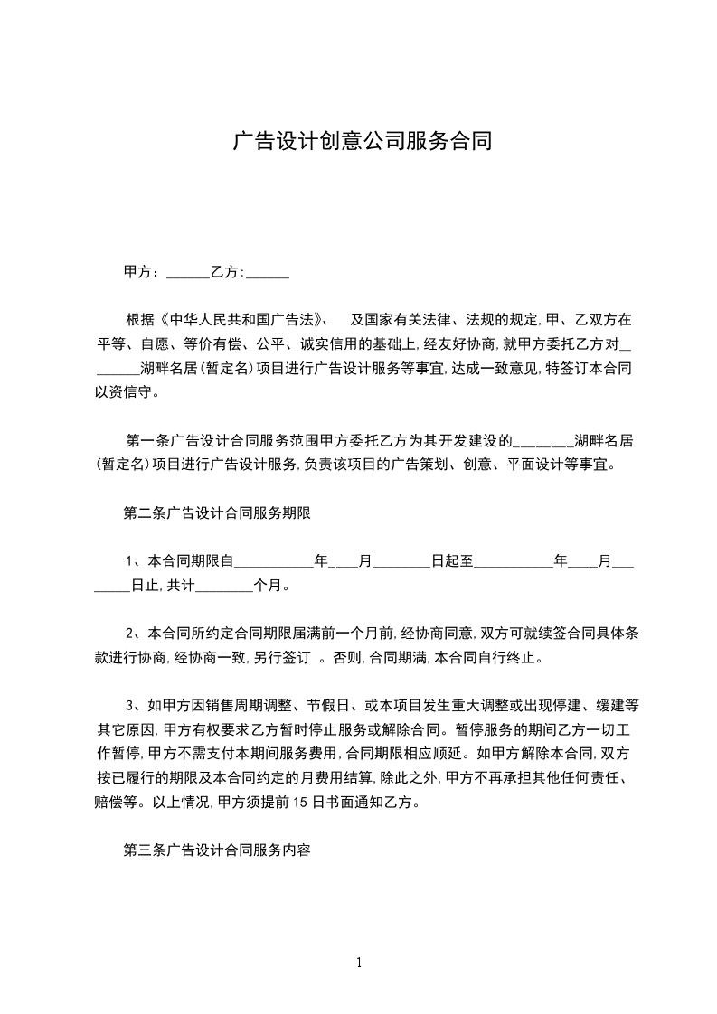 根据《中华人民共和国广告法》、 及国家有关法律、法规的规定,甲、乙双方在平等、自愿、等价有偿、公平、诚实信用的基础上,经友好协商,就甲方委托乙方对________湖畔名居(暂定名)项目进行广告设计服务等事宜,达成一致意见,特签订本合同,以资信守。