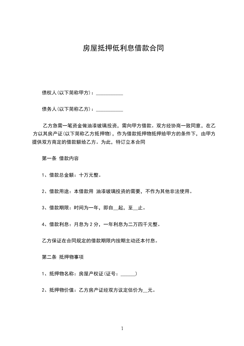 乙方急需一笔资金做油漆玻璃投资,需向甲方借款。双方经协商一致同意,在乙方以其房产证(以下简称乙方抵押物),作为借款抵押物抵押给甲方的条件下,由甲方提供双方商定的借款额给乙方。为此,特订立本合同