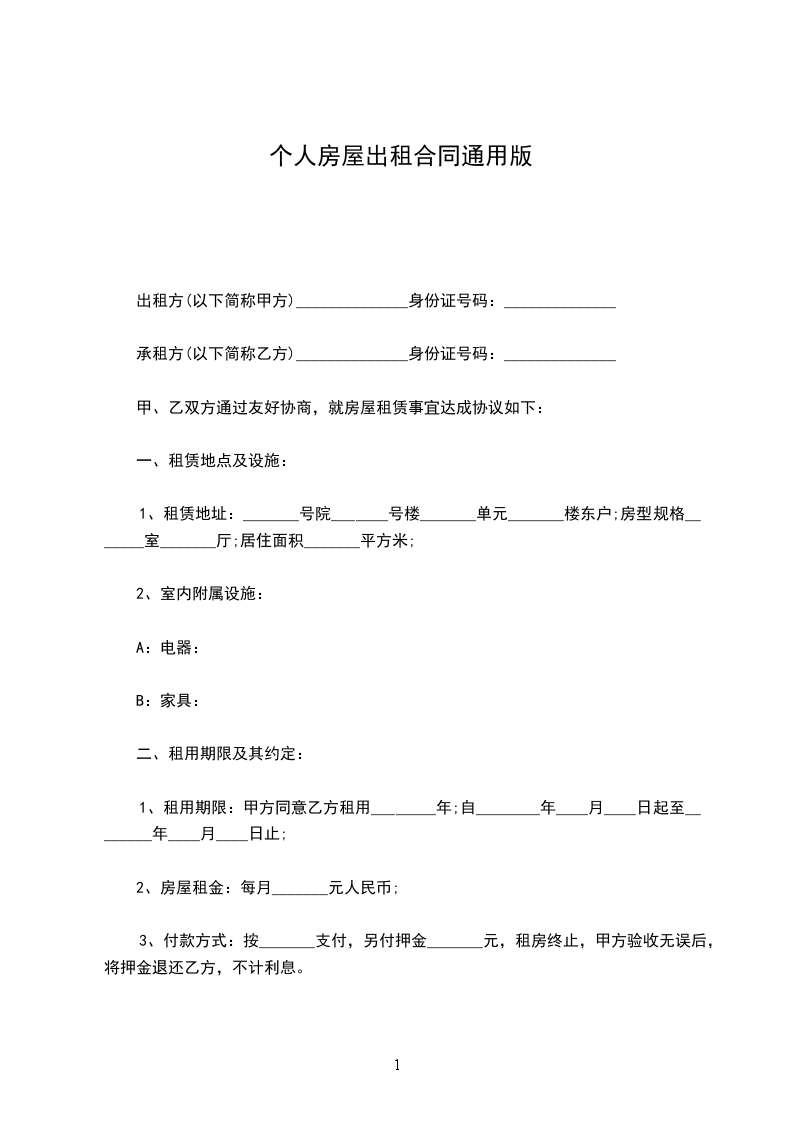出租方(以下简称甲方)______________身份证号码:______________