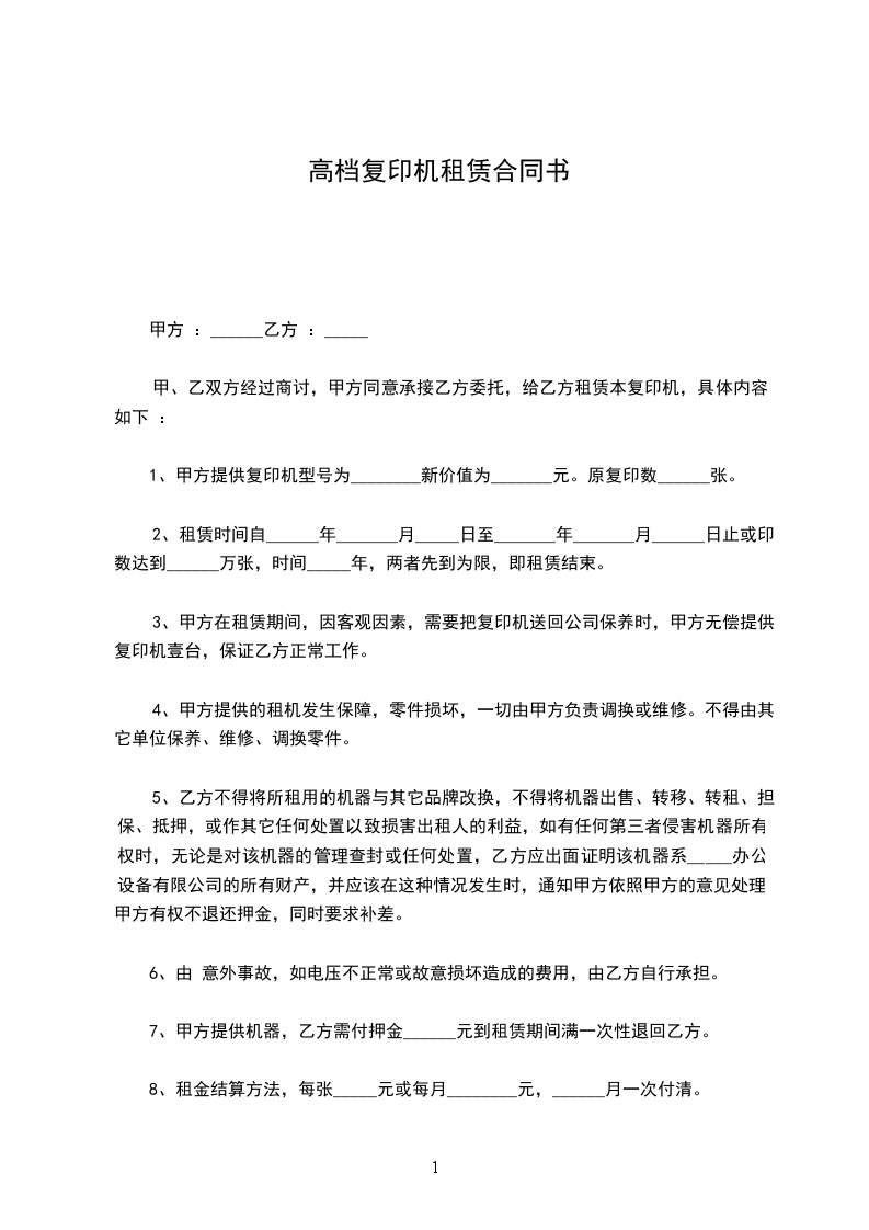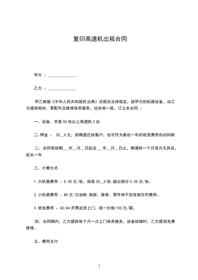 1.大机器费用 :___元/张,保底__张;超出部分___元/张。
