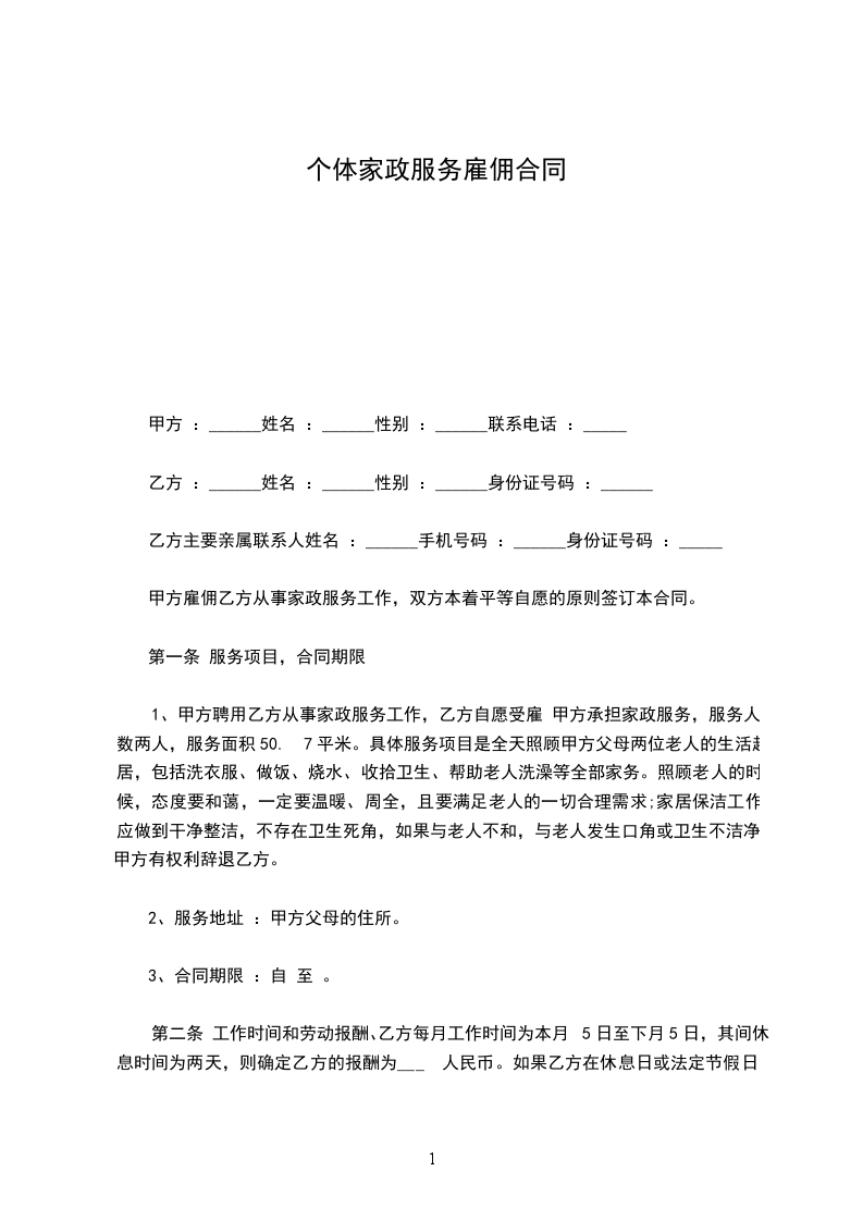 1、甲方聘用乙方从事家政服务工作,乙方自愿受雇 甲方承担家政服务,服务人数两人,服务面积50. 7平米。具体服务项目是全天照顾甲方父母两位老人的生活起居,包括洗衣服、做饭、烧水、收拾卫生、帮助老人洗澡等全部家务。照顾老人的时候,态度要和蔼,一定要温暖、周全,且要满足老人的一切合理需求;家居保洁工作应做到干净整洁,不存在卫生死角,如果与老人不和,与老人发生口角或卫生不洁净,甲方有权利辞退乙方。