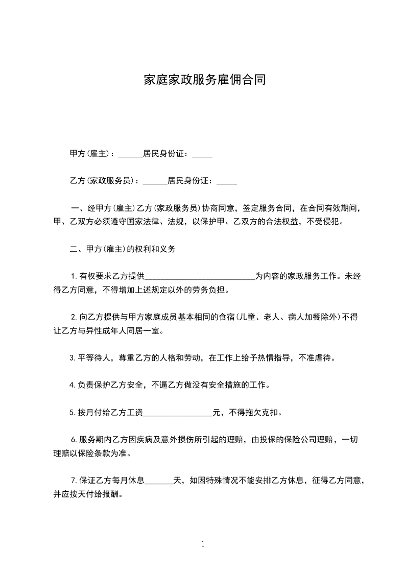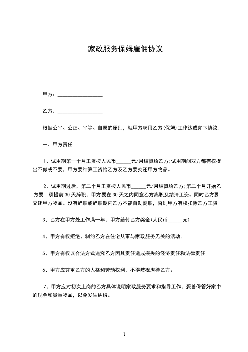 甲方雇佣乙方从事家政服务工作,双方本着平等自愿的原则签订本合同。
