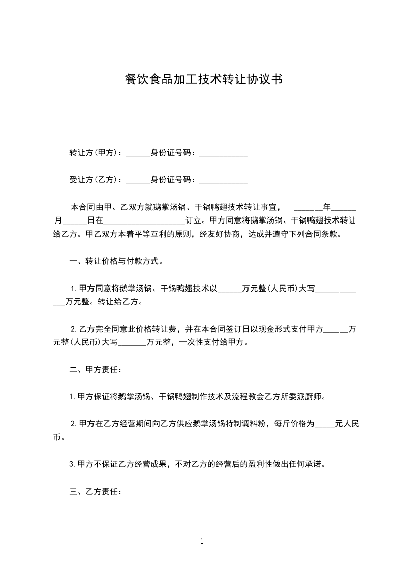 1.甲方同意将鹅掌汤锅、干锅鸭翅技术以______万元整(人民币)大写_____________万元整。转让给乙方。