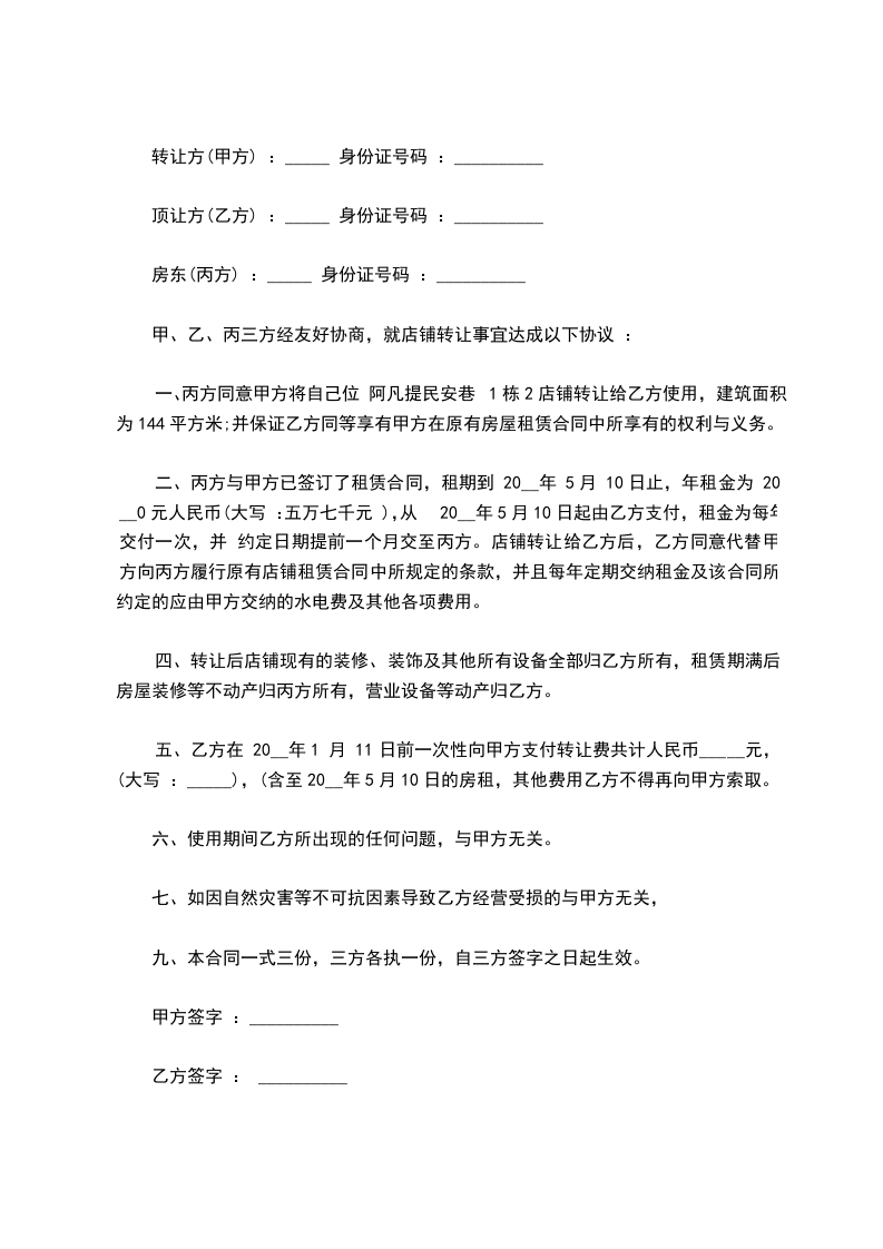 顶让方(乙方) :_____ 身份证号码 :__________