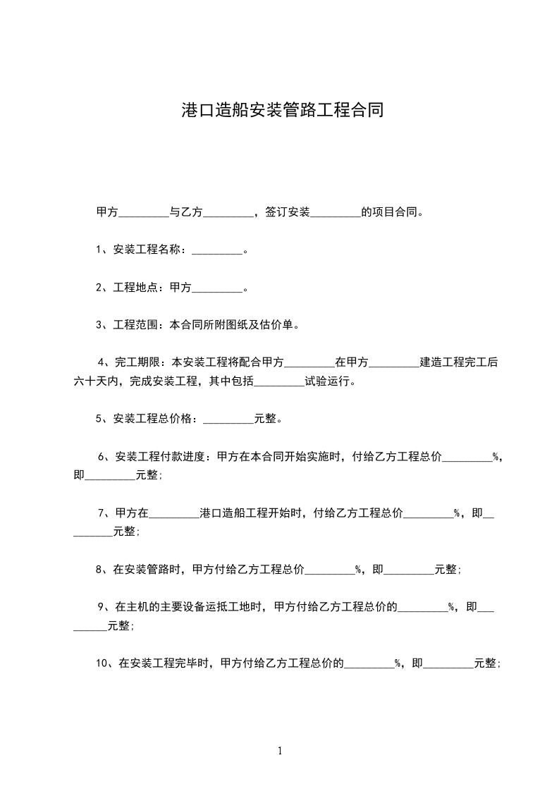 4.完工期限:本安装工程将配合甲方_________________在甲方港口建造工程完工后六十(60)天内,完成安装工程,其中包括主机试验运行