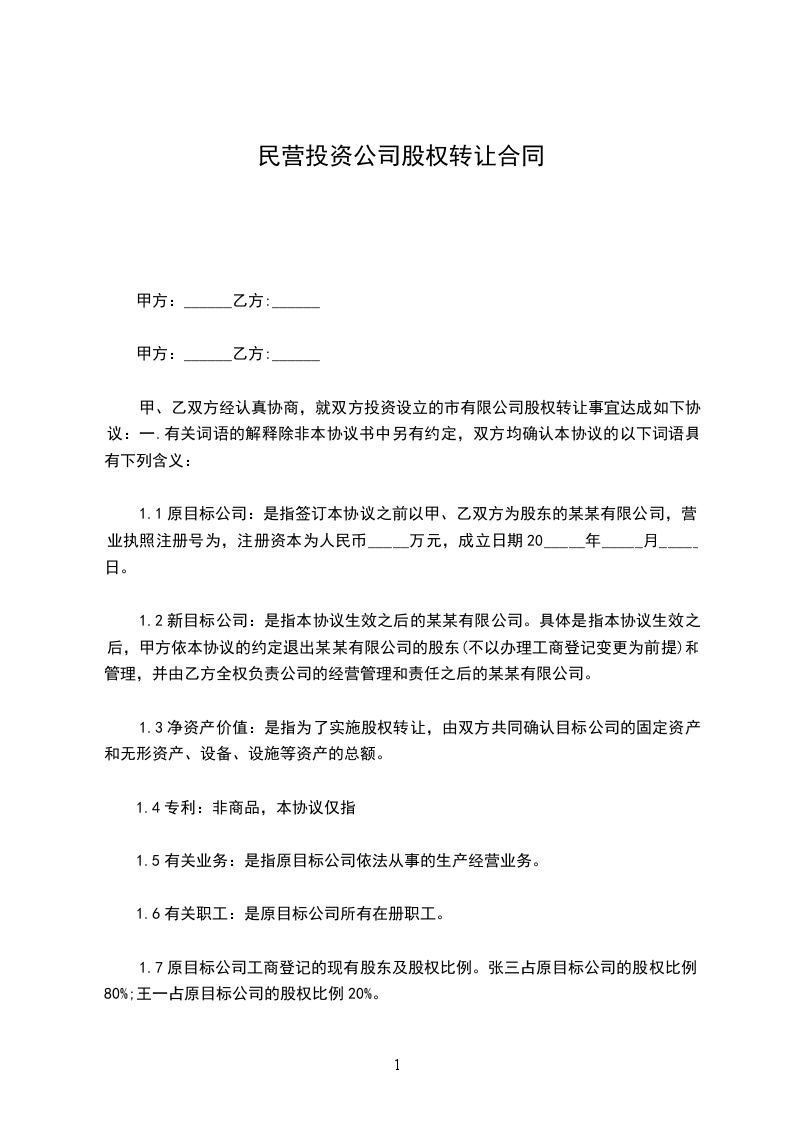 1.7原目标公司工商登记的现有股东及股权比例。张三占原目标公司的股权比例80%;王一占原目标公司的股权比例20%。