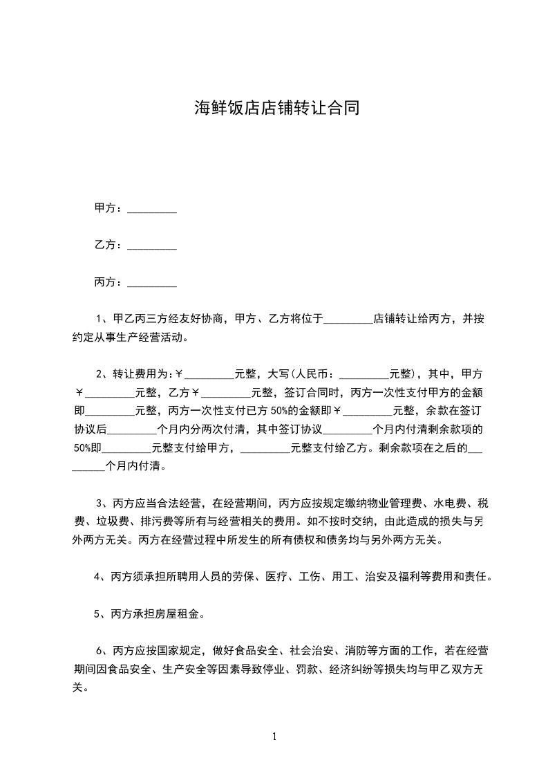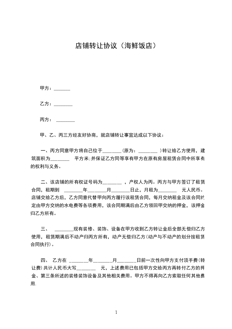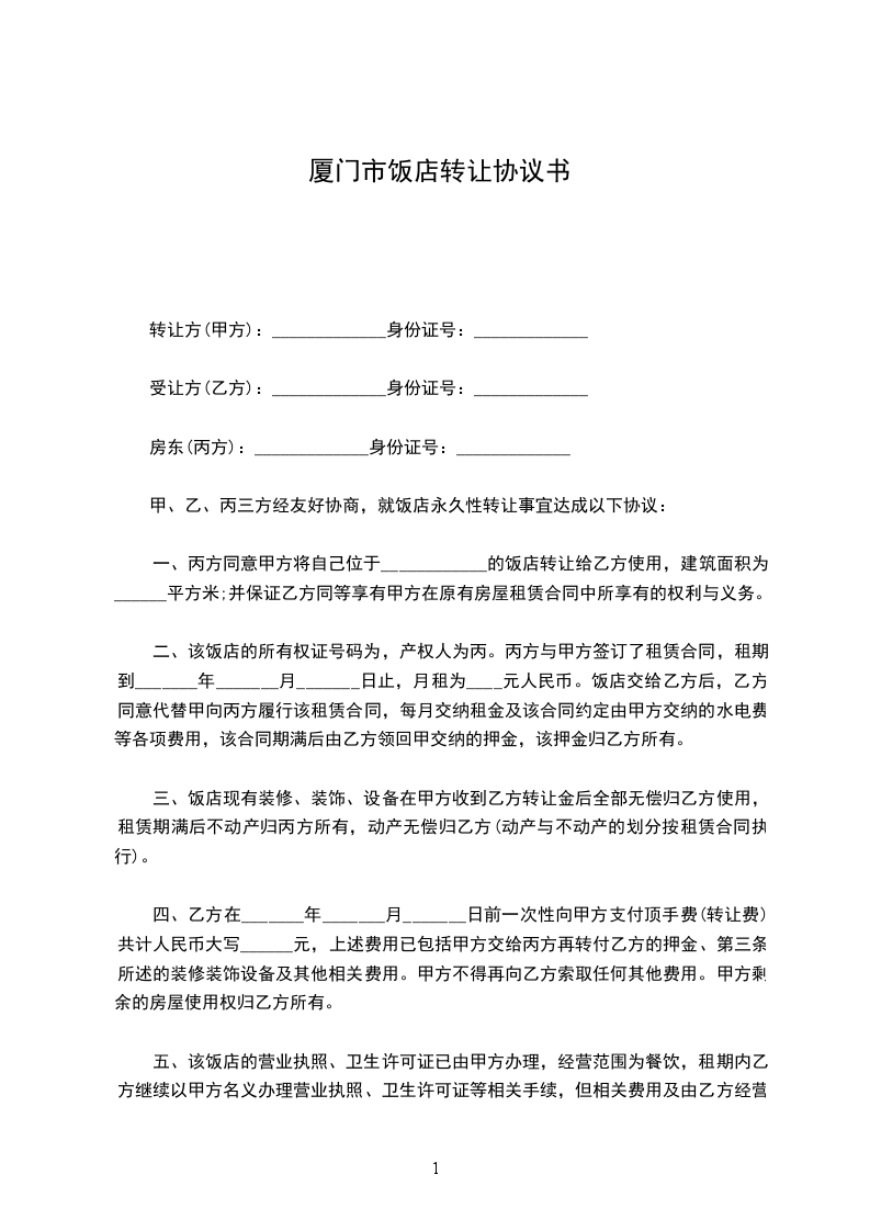 1、双方在约定时间内交接完成后,乙方支付给甲方转让费 元大写:。