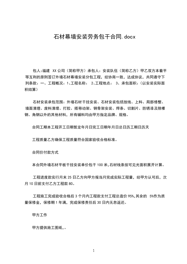 价款支付:承包方人员和主材(槽钢、角铁)全部进场后,发包方支付合同总价款_____%;金属骨架全部施工完后支付总价款_____%;石材安装_____%后支付总价款_____%;石材幕墙工程全部完成并验收合格后支付总价款_____%;剩余_____%留作质量保修金,待2年保修期满后如无质量问题,一次性付清。