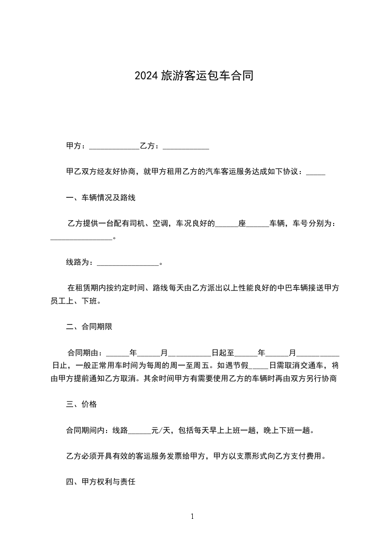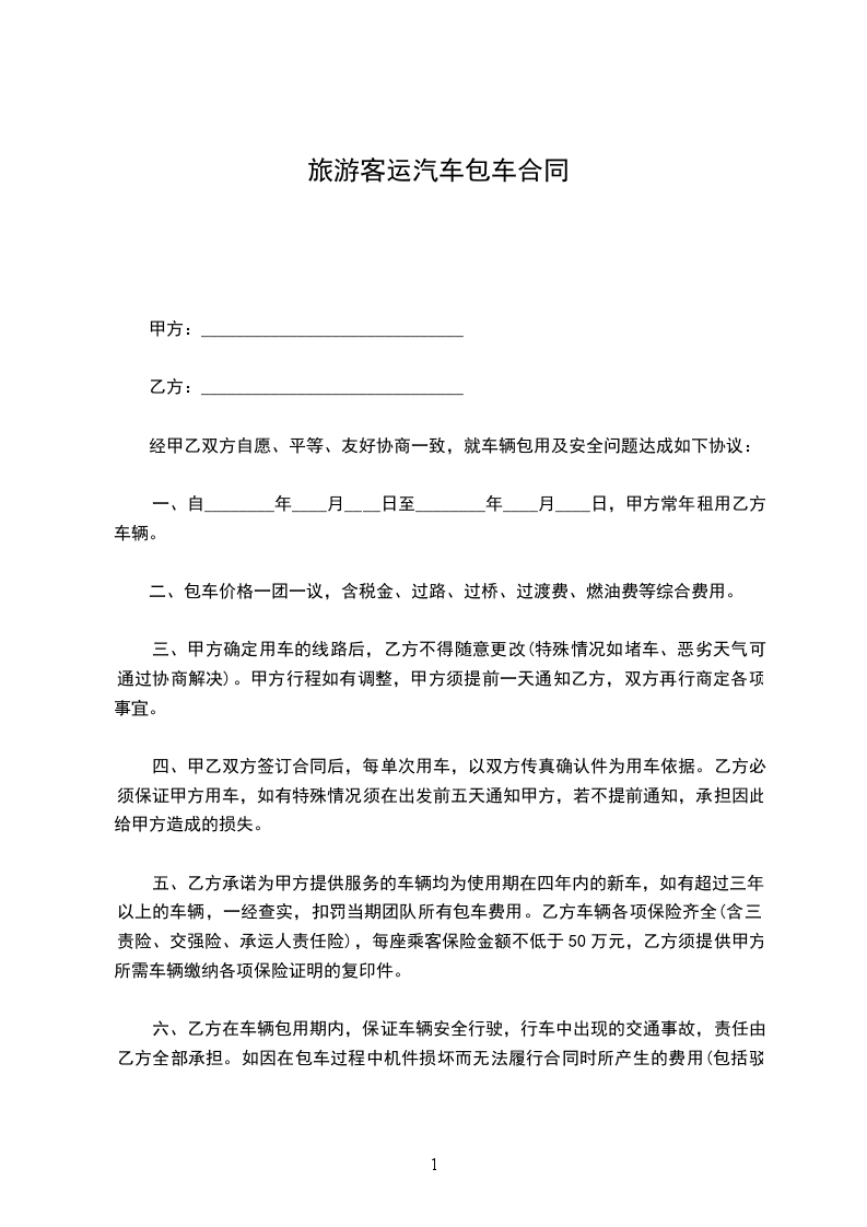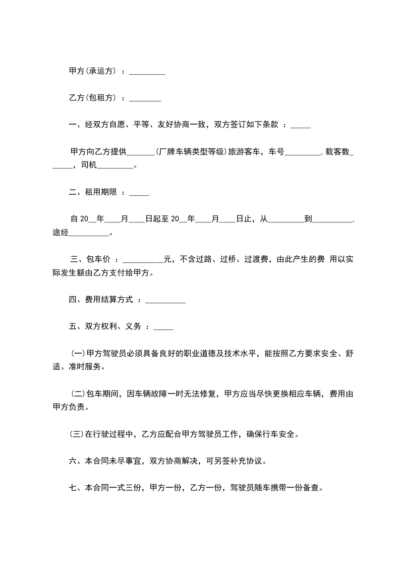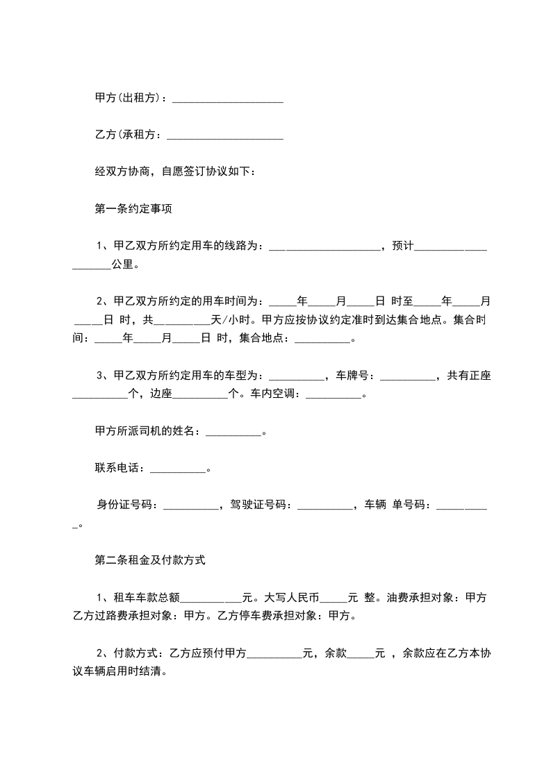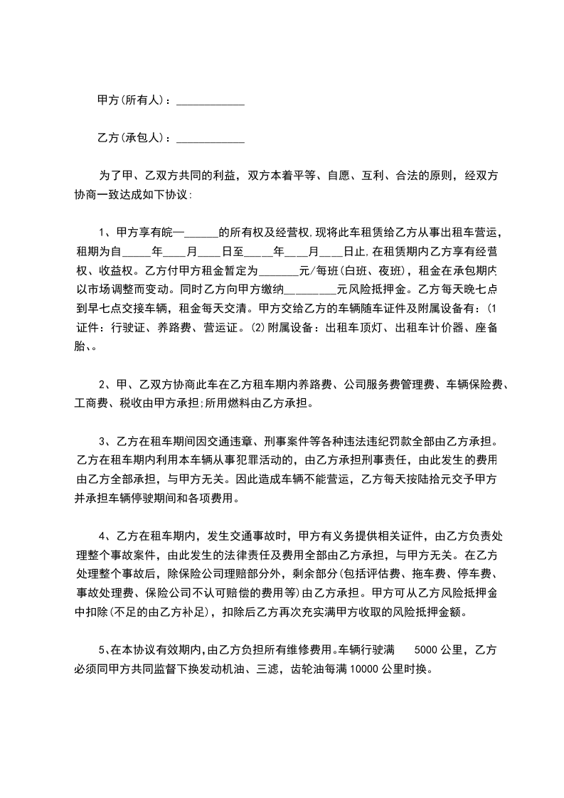 1、甲方享有皖—______的所有权及经营权,现将此车租赁给乙方从事出租车营运,租期为自_____年____月____日至_____年____月____日止,在租赁期内乙方享有经营权、收益权。乙方付甲方租金暂定为_______元/每班(白班、夜班),租金在承包期内以市场调整而变动。同时乙方向甲方缴纳_________元风险抵押金。乙方每天晚七点到早七点交接车辆,租金每天交清。甲方交给乙方的车辆随车证件及附属设备有:(1)证件:行驶证、养路费、营运证。(2)附属设备:出租车顶灯、出租车计价器、座备胎、 。