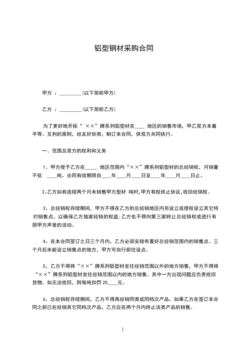 1、甲方授予乙方在_____ 地区范围内“××”牌系列铝型材的总经销权,月销量不低 ____吨。合同有效期限自____年____月____日至____年____月____日止。