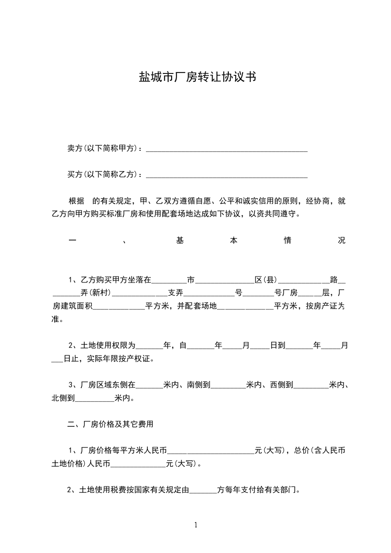 1、厂房价格每平方米人民币______________________元(大写),总价(含人民币土地价格)人民币______________元(大写)。