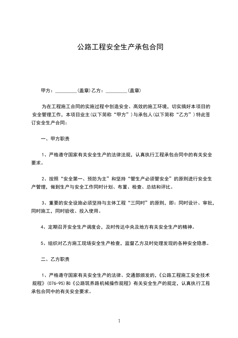 1、严格遵守国家有关安全生产的法律、交通部颁发的,《公路工程施工安全技术规程》(076-95)和《公路筑养路机械操作规程》有关安全生产的规定,认真执行工程承包合同中的有关安全要求。
