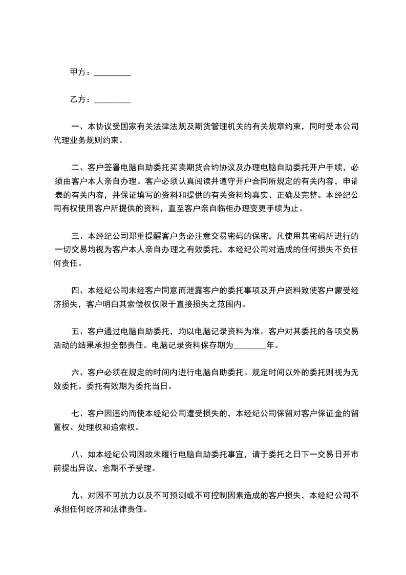 十五、本协议一式二份。为本公司《合同文件》的有效组成部分,由客户和期货经纪公司授权人签章后即生效。客户和本经纪公司各执一份,均具有同等法律效力。
