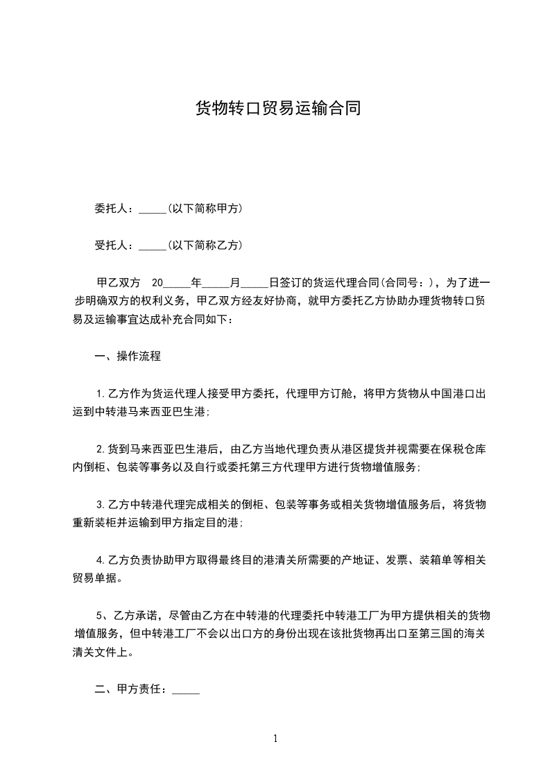 甲乙双方 20_____年_____月_____日签订的货运代理合同(合同号:),为了进一步明确双方的权利义务,甲乙双方经友好协商,就甲方委托乙方协助办理货物转口贸易及运输事宜达成补充合同如下: