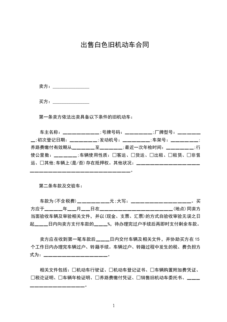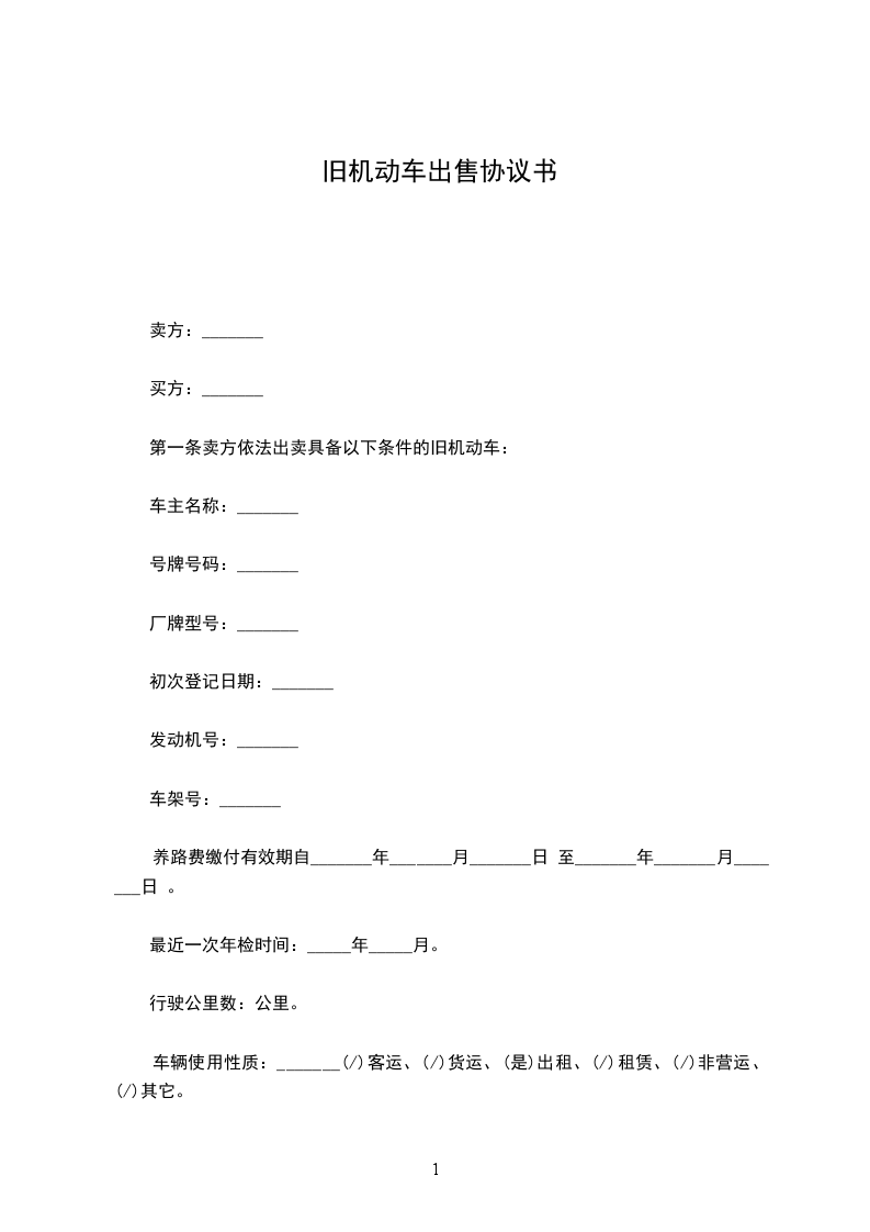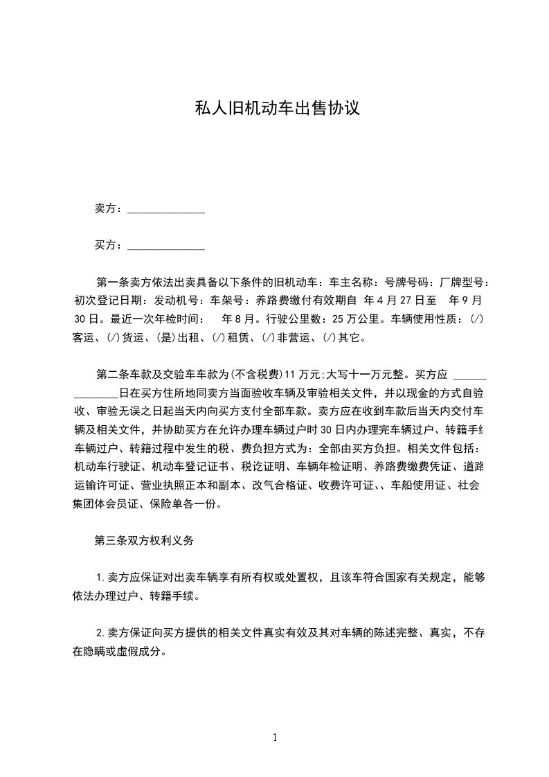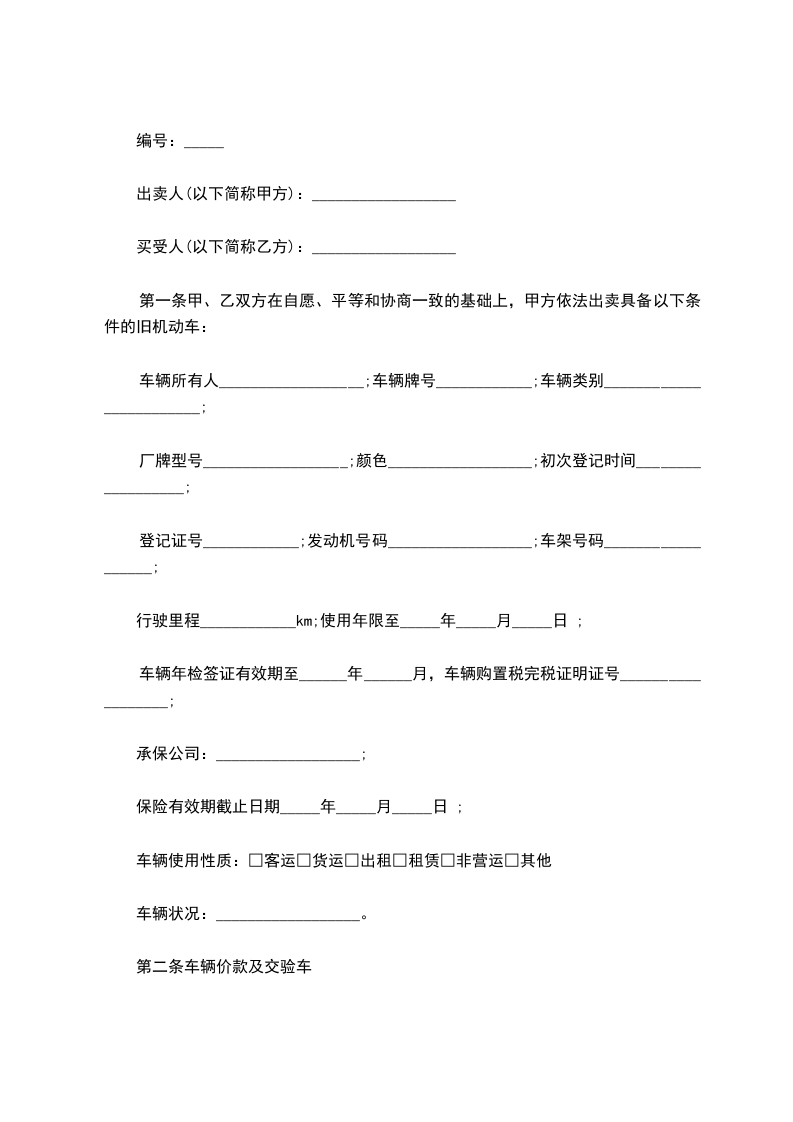 第一条卖方依法出卖具备以下条件的旧机动车:车主名称:号牌号码:厂牌型号:初次登记日期:发动机号:车架号:养路费缴付有效期自 年4月27日至 年9月30日。最近一次年检时间: 年8月。行驶公里数:25万公里。车辆使用性质:(/)客运、(/)货运、(是)出租、(/)租赁、(/)非营运、(/)其它。