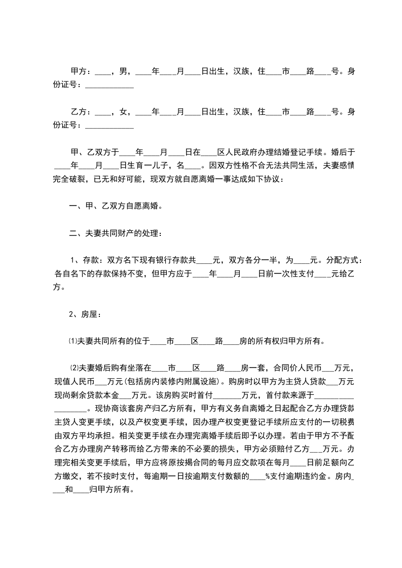 ⑴存款 :双方名下现有银行存款共____________元,男女双方按_______比例分配,男方得_________元;女方得 _________元。分配方式 :各自名下的存款保持不变,但男方应 ________年___月___日前一次性支付________元给女方。