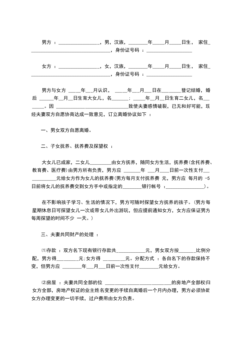男方与女方 _____年___月认识, _____年___月___日在________登记结婚,婚后 ______年__月__日生育大女儿,名_______; _____年__月__日生育二女儿,名________。因 ______________________________致使夫妻感情破裂,已无和好可能,现经夫妻双方自愿协商达成一致意见,订立离婚协议如下 :