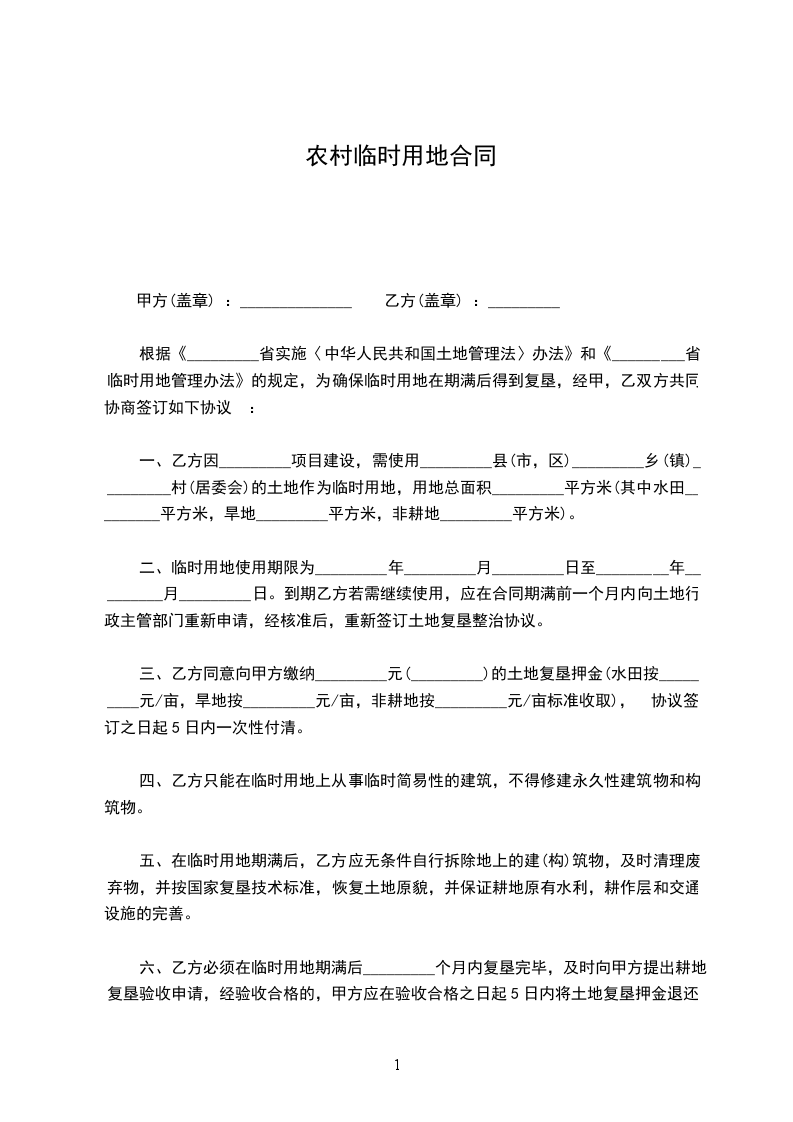 根据《_________省实施〈中华人民共和国土地管理法〉办法》和《_________省临时用地管理办法》的规定,为确保临时用地在期满后得到复垦,经甲,乙双方共同协商签订如下协议 :