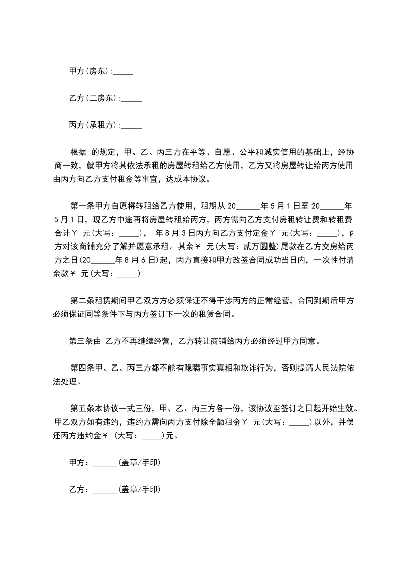 第一条甲方自愿将转租给乙方使用,租期从20______年5月1日至20______年5月1日,现乙方中途再将房屋转租给丙方,丙方需向乙方支付房租转让费和转租费合计¥ 元(大写:_____), 年8月3日丙方向乙方支付定金¥ 元(大写:_____),丙方对该商铺充分了解并愿意承租。其余¥ 元(大写:贰万圆整)尾款在乙方交房给丙方之日(20______年8月6日)起,丙方直接和甲方改签合同成功当日内,一次性付清余款¥ 元(大写:_____)