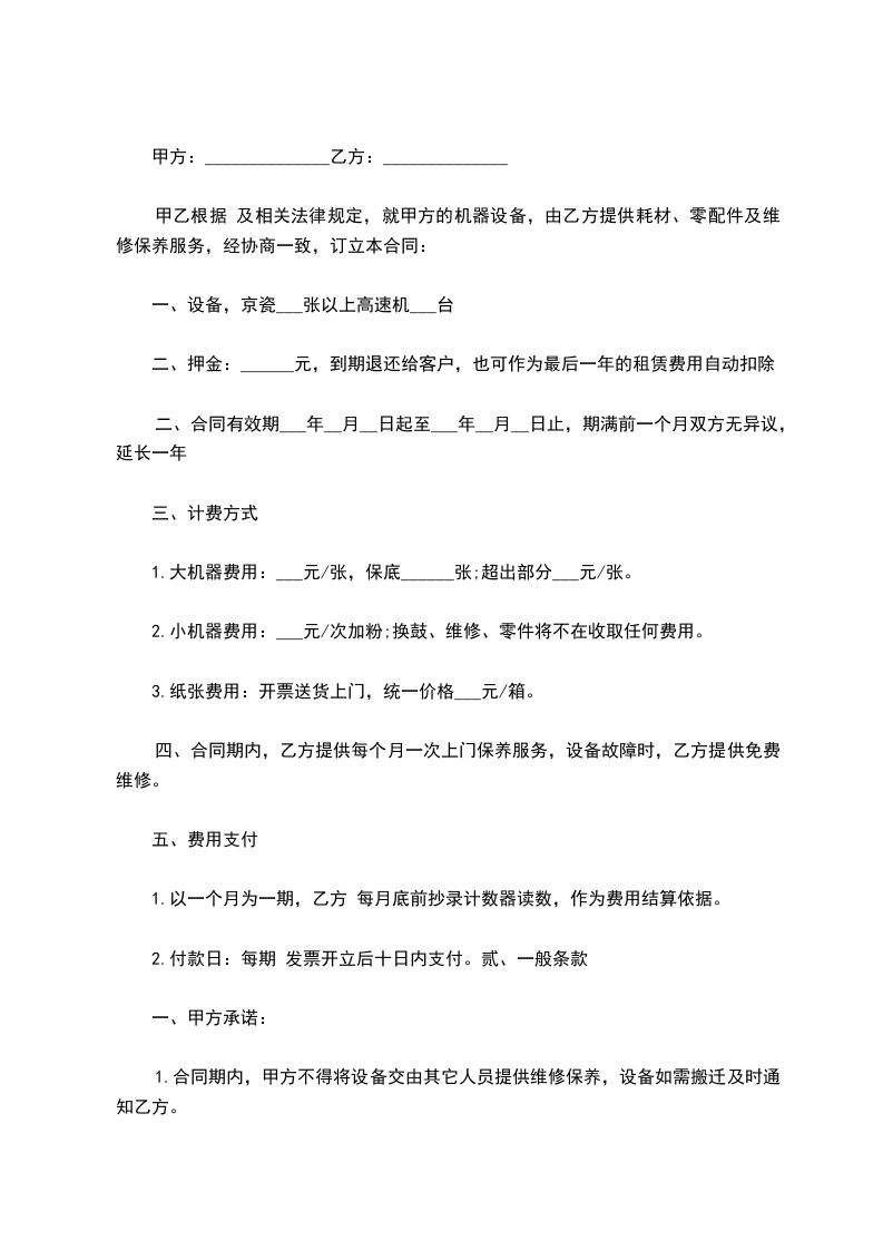 五、甲方责任 :在租赁合同期内,维修、耗材、配件甲方负责(纸张除外)免费为乙方培训操作人员,提供咨询服务。当机器出现临时故障时,甲方在接到乙方通知后24小时内保证机器正常,如遇到特殊故障(在两天内修复不成),甲方提供另一台性能完好的机器给乙方使用,直到机器修复为止。