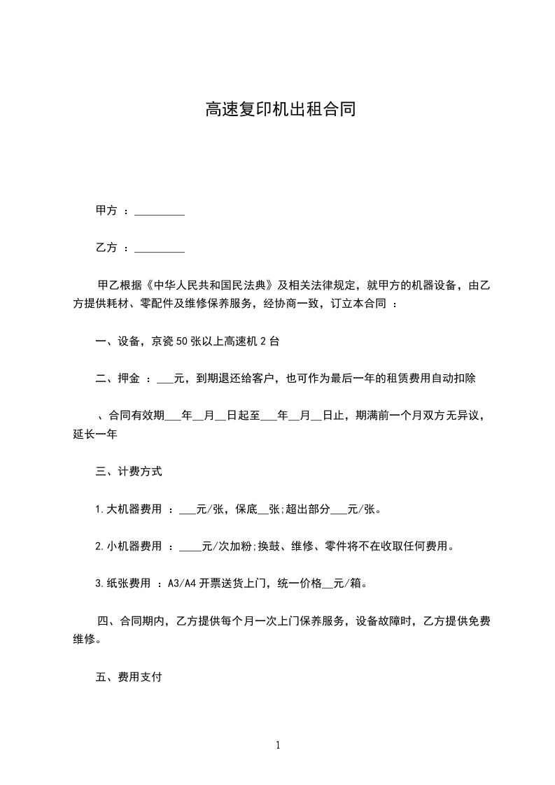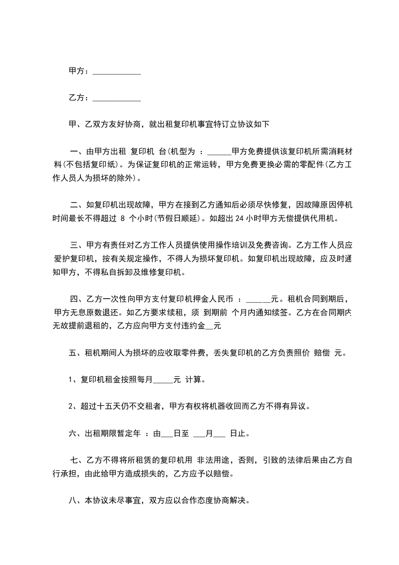 一、乙方向甲方租赁复印机_________台,机型_________,经甲、乙双方协商,特达成如下租赁协议。