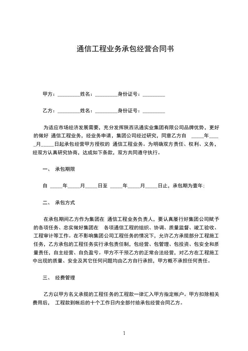 为适应市场经济发展需要,充分发挥陕西讯通实业集团有限公司品牌优势,更好的做好 通信工程业务,经业务申请,集团公司经过研究,同意乙方自 _____年_____月_____日起承包经营甲方授权的 通信工程业务。为明确双方责任、权利、义务,经双方认真研究协商,达成如下条款,双方共同遵守执行。