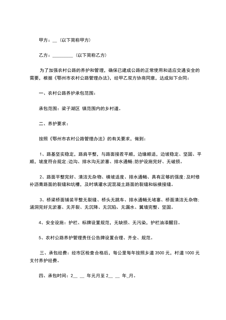 为了加强农村公路的养护和管理,确保已建成公路的正常使用和适应交通安全的需要,根据《鄂州市农村公路管理办法》,经甲乙双方协商同意,达成如下合同: