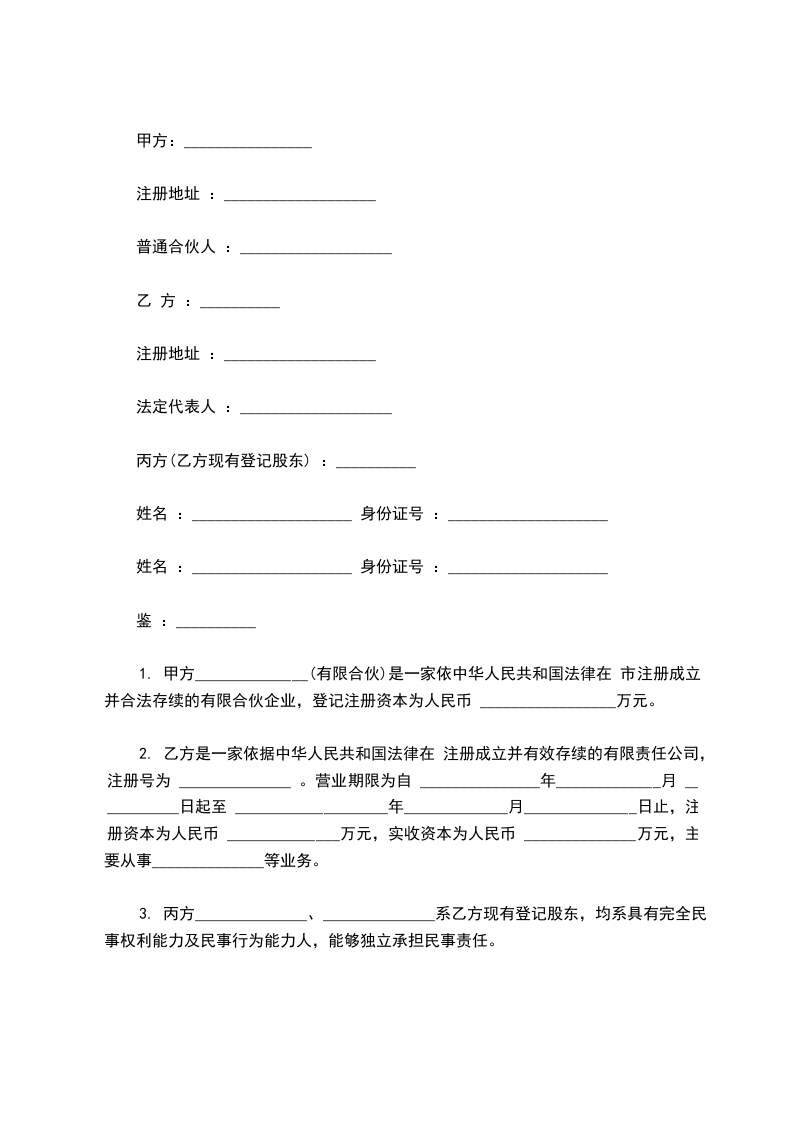 1. 甲方______________(有限合伙)是一家依中华人民共和国法律在 市注册成立并合法存续的有限合伙企业,登记注册资本为人民币 _________________万元。
