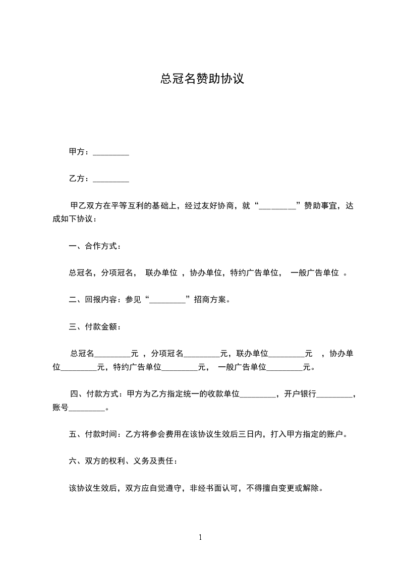 四、赞助事项独家赞助:_________万元人民币指定账户:______:__________________账号___________________________转入方式:______月_____日转入赞助总额的_____%,_____月_____日转入_____%,_____月_____日之前乙方将剩余的赞助款全部转入甲方的账户:______.甲方按实际进账数额,为乙方开出正式票据.