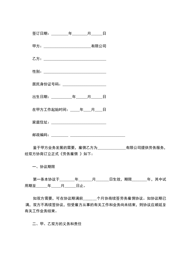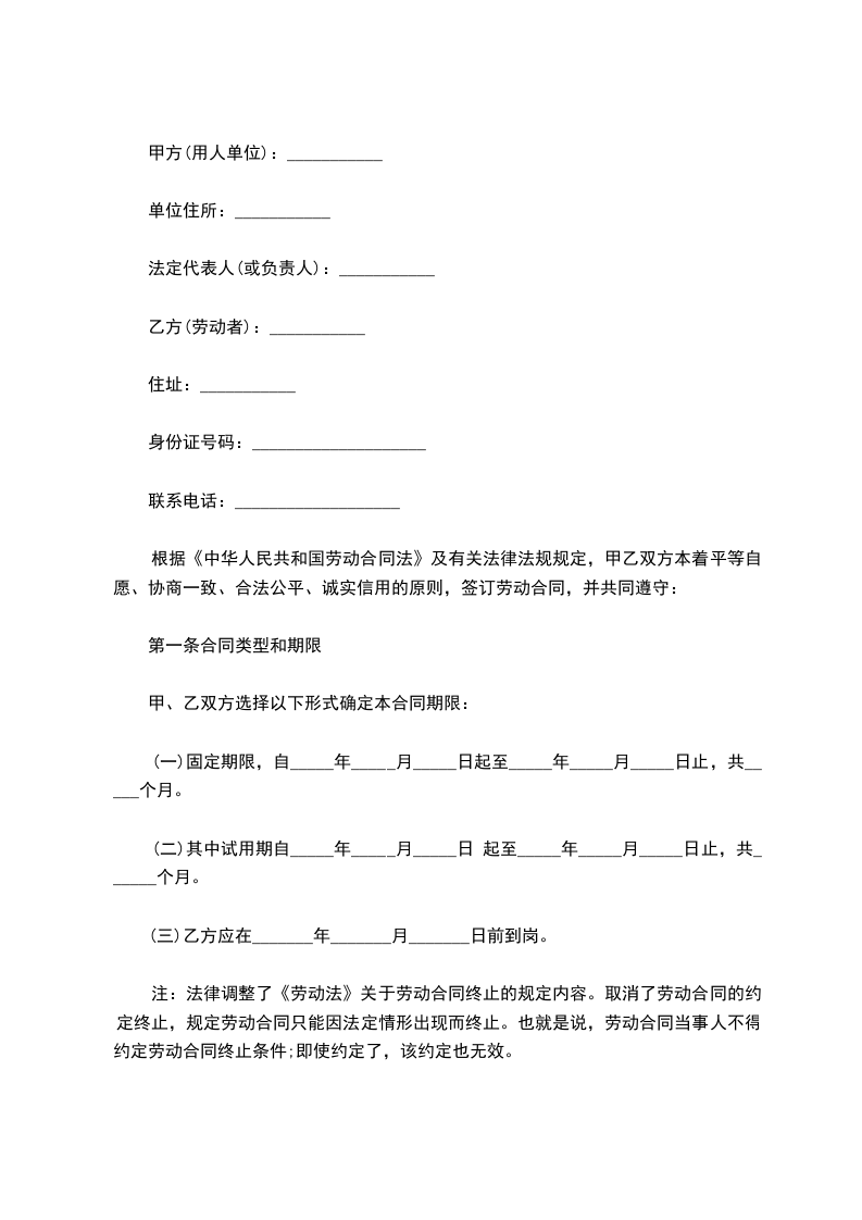 甲方因生产经营需要,经考核,录用乙方_________(姓名)为_________(工程名称)工人,遵照国家有关劳动法律法规,经双方协商,签订本合同。