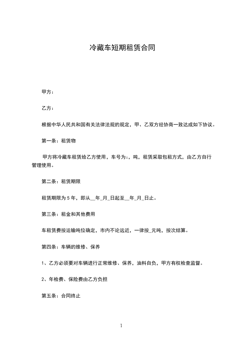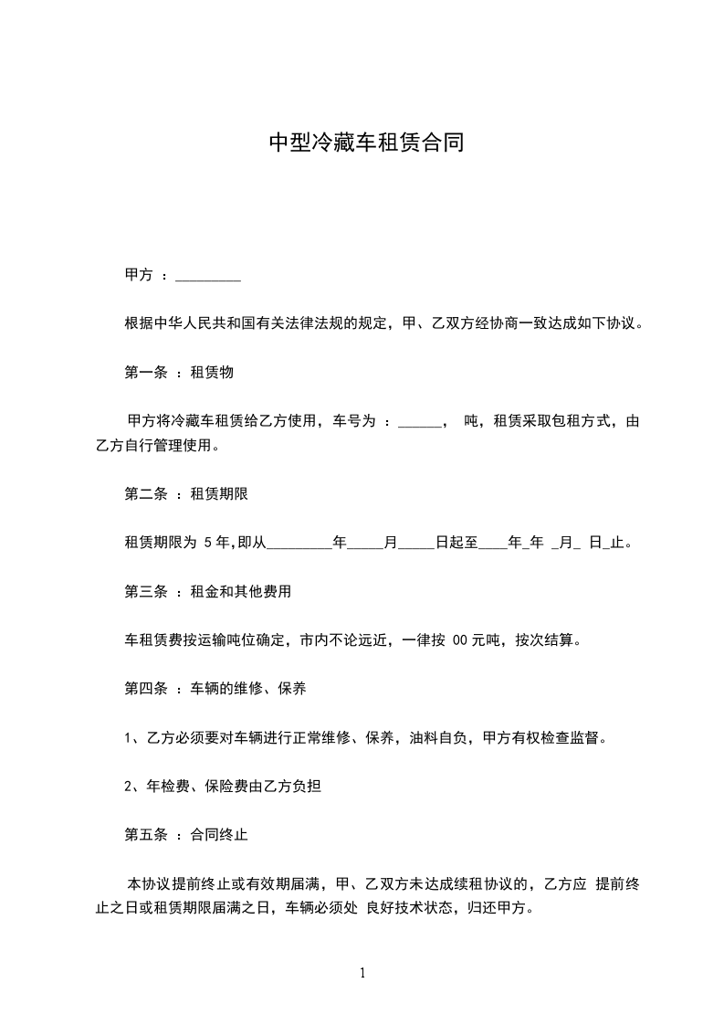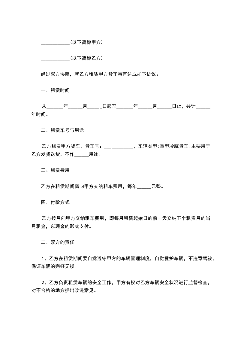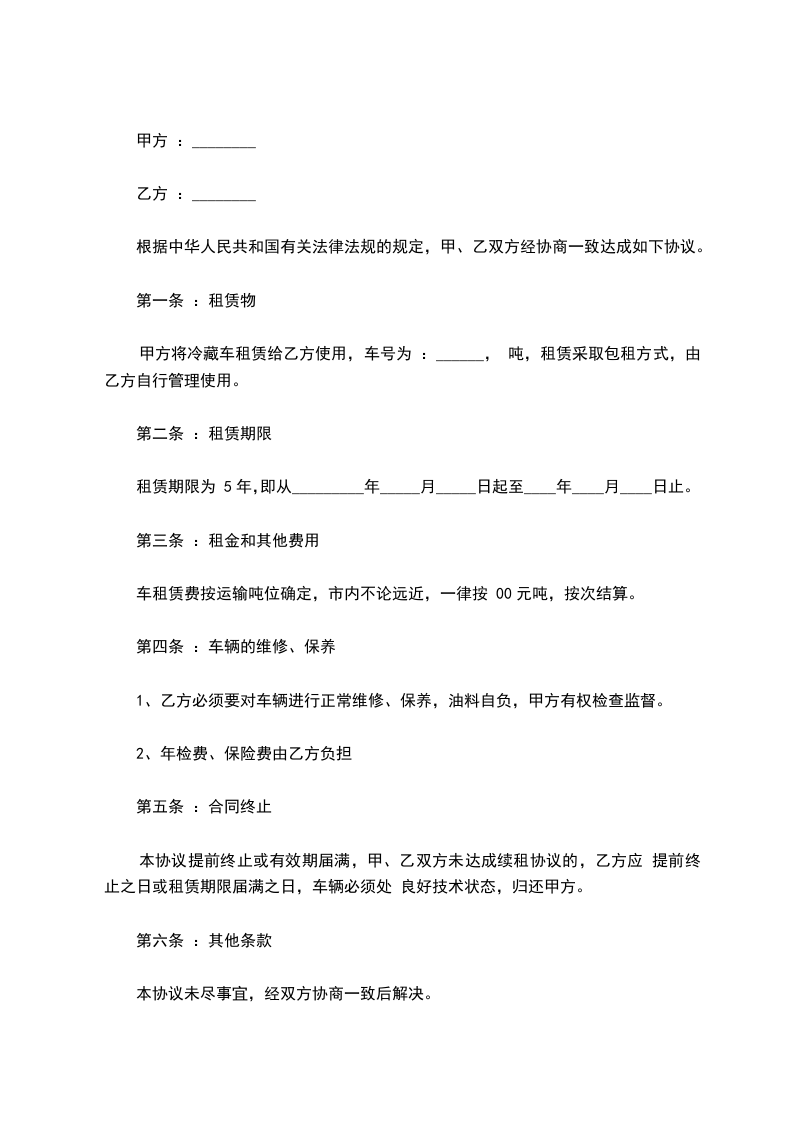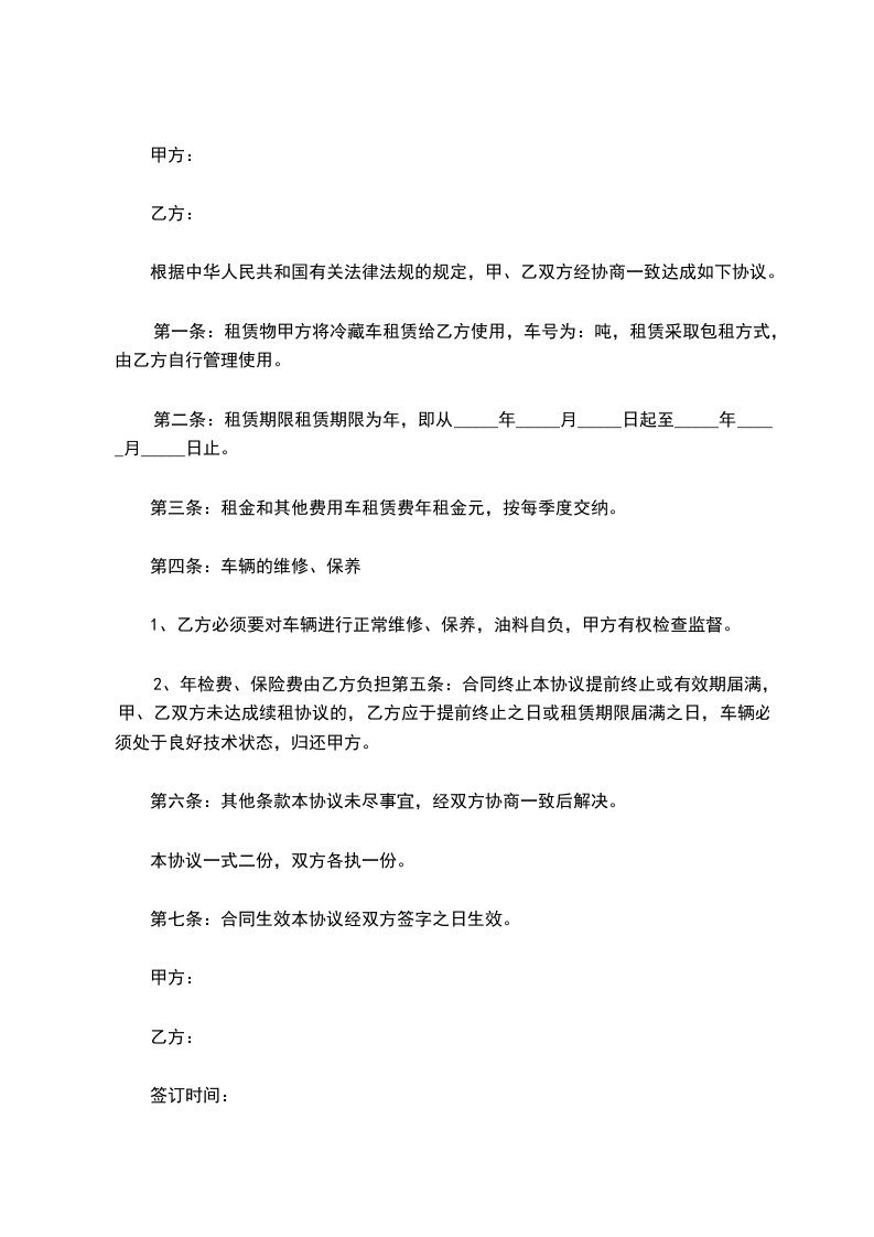 甲方将冷藏车租赁给乙方使用,车号为 :______, 吨,租赁采取包租方式,由乙方自行管理使用。