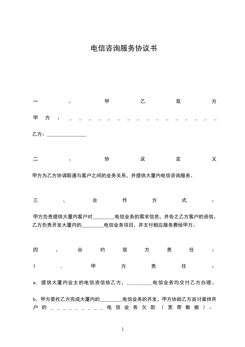 1.乙方与甲方共同合作开发_____公司在_______大厦内客户,乙方所签约客户必须告之甲方,乙方长途语音总营业额的___%,宽带数据总营业额的_________%作为服务费交付甲方(税金甲方自理)。