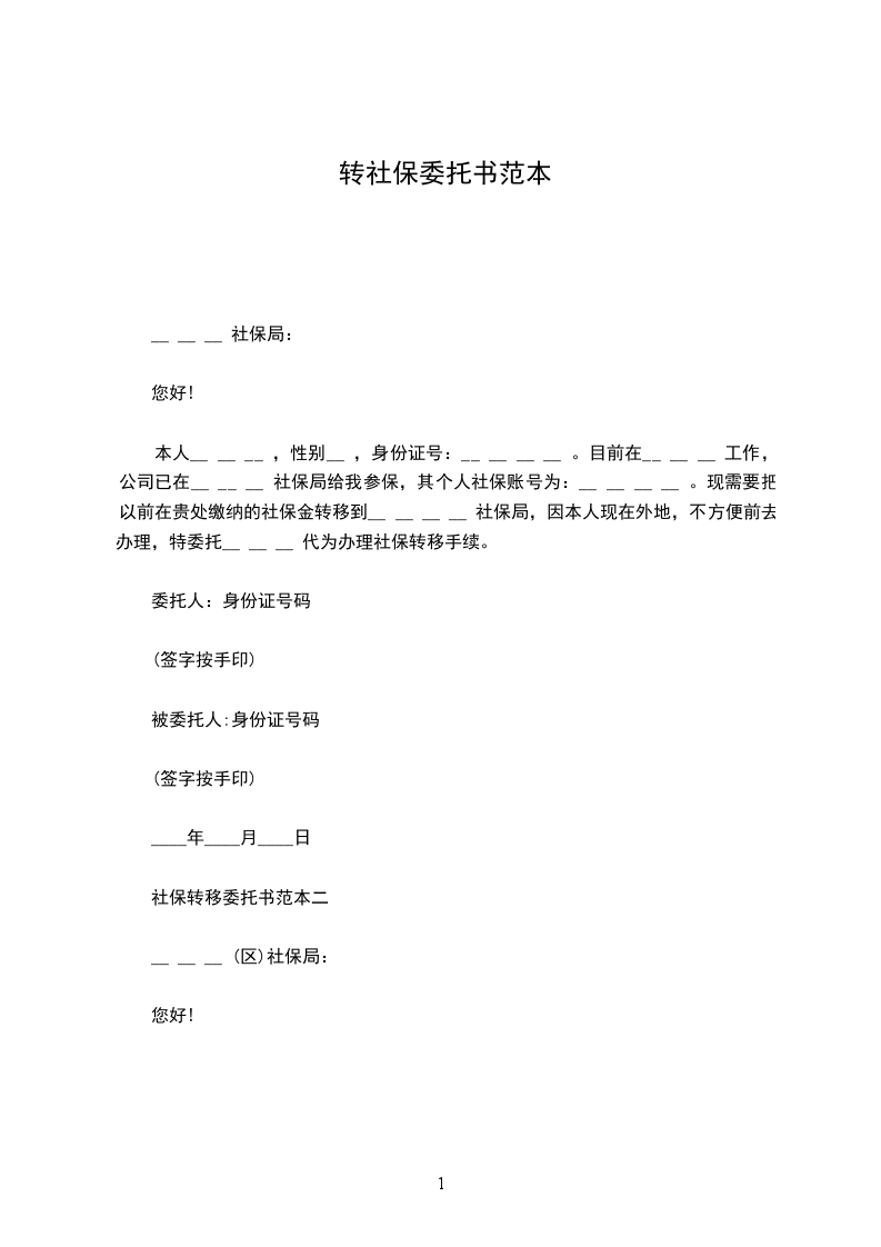 本人__ __ __ ,性别__ ,身份证号:__ __ __ __ 。目前在__ __ __ 工作,公司已在__ __ __ 社保局给我参保,其个人社保账号为:__ __ __ __ 。现需要把以前在贵处缴纳的社保金转移到__ __ __ __ 社保局,因本人现在外地,不方便前去办理,特委托__ __ __ 代为办理社保转移手续。