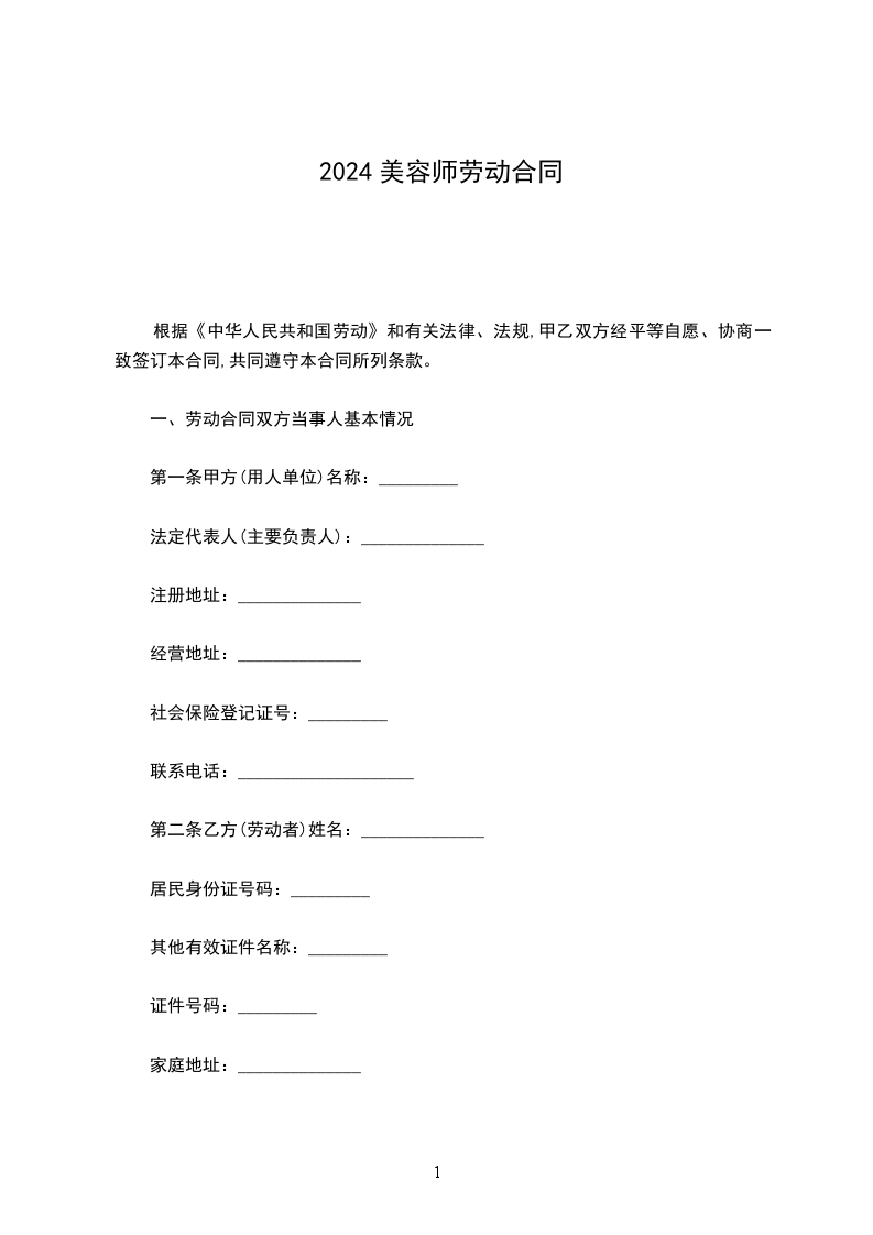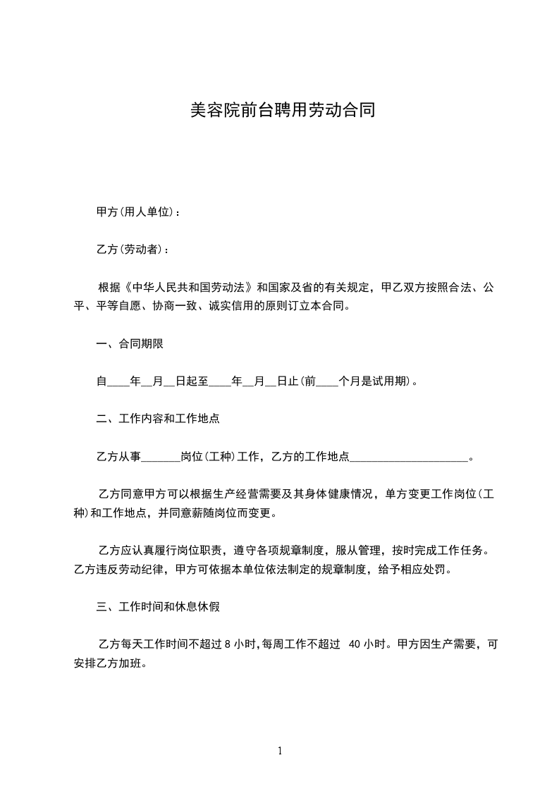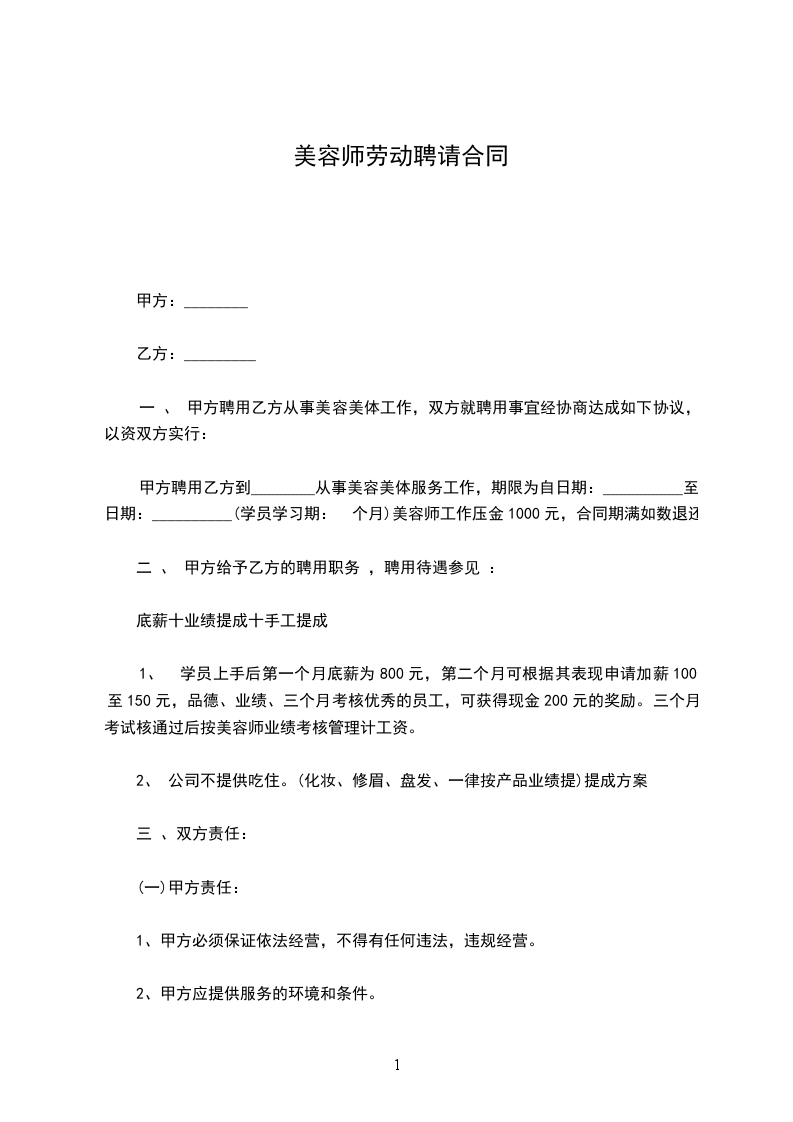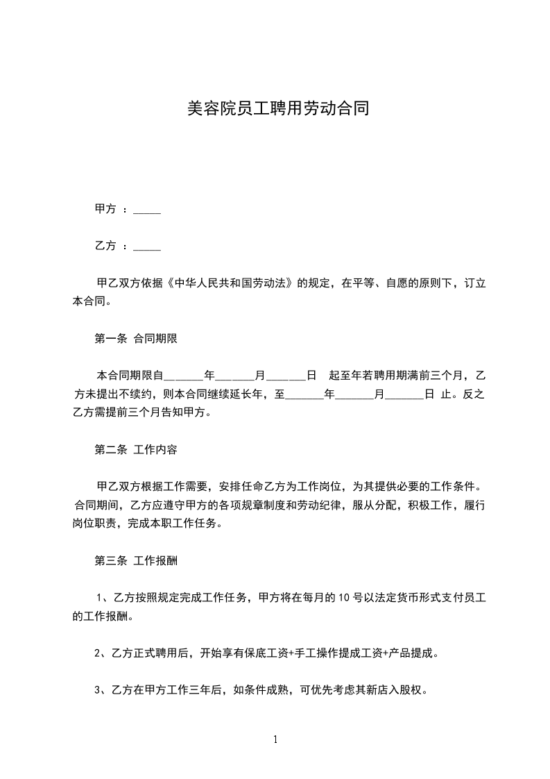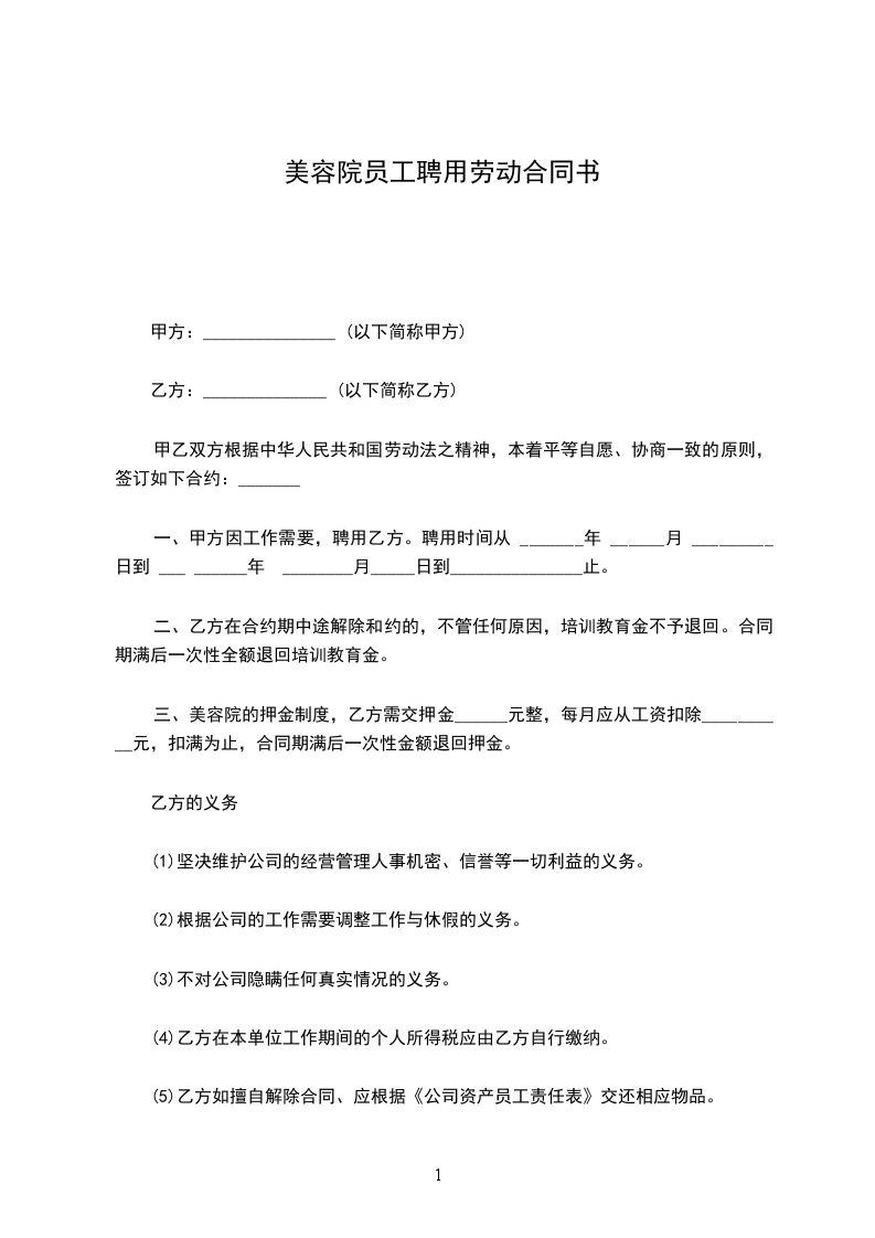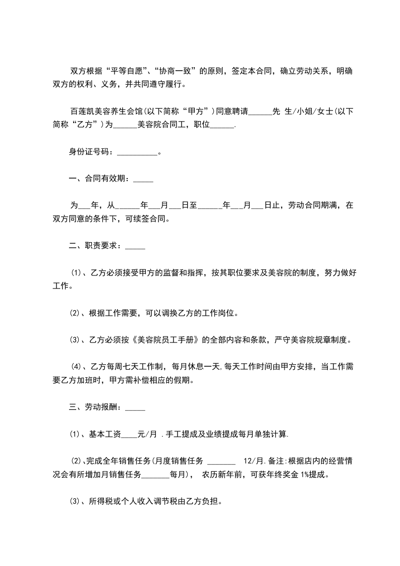 一 、 甲方聘用乙方从事美容美体工作,双方就聘用事宜经协商达成如下协议,以资双方实行: