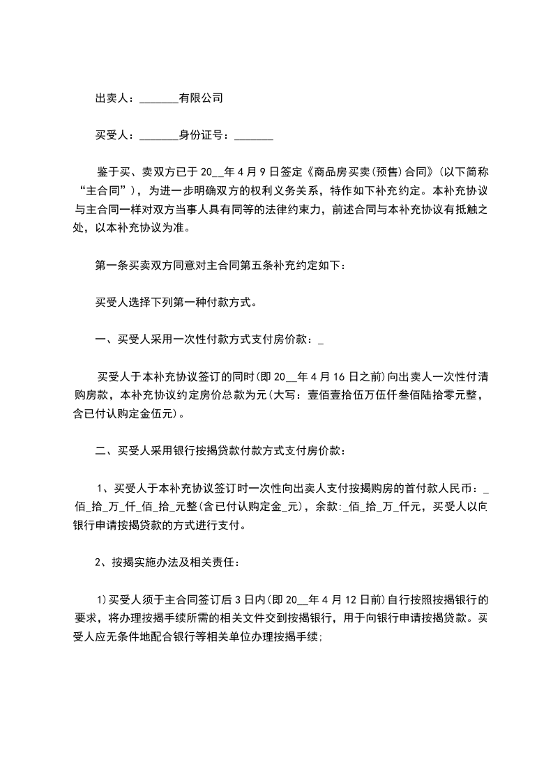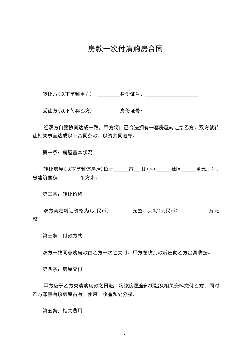 二、甲、乙双方议定的上述房屋成交价格为人民币(大写)共 万 仟 佰 元(小写 元),乙方在 _____年_____月_____日 前,一次付给甲方。