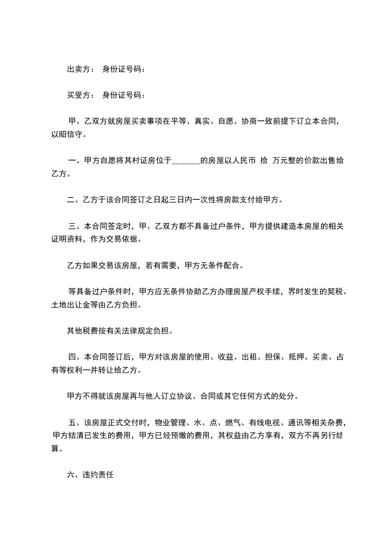 一、甲方自愿将坐落在 市 镇 村 号(自建住宅)的房屋,东至 南至 西至 北至 建筑面积 平方米,出售给乙方。