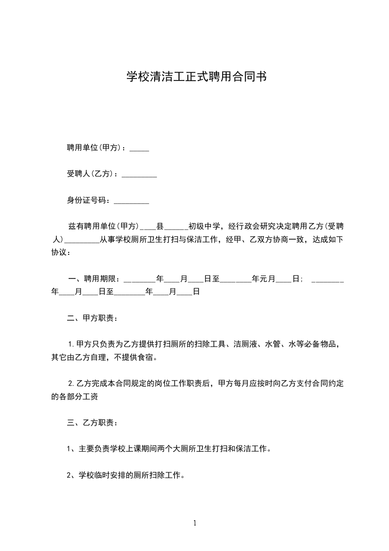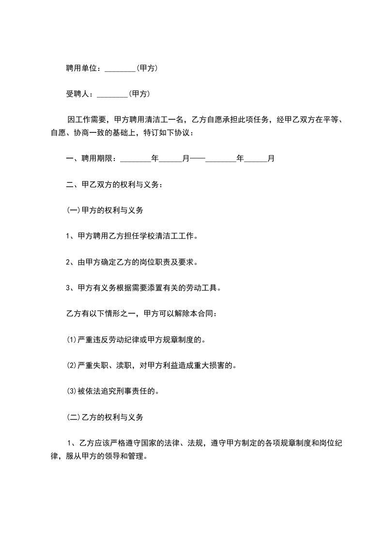 兹有聘用单位(甲方)________初级中学,经行政会研究决定聘用乙方(受聘人)_________从事学校厕所卫生打扫与保洁工作,经甲、乙双方协商一致,达成如下协议 :