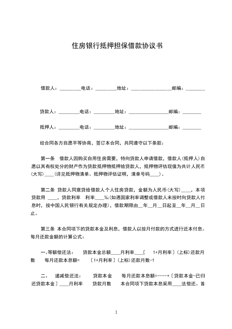 第一条 借款人因购买自用住房需要,特向贷款人申请借款,借款人(抵押人)自愿以其有权处分的财产作为贷款抵押物抵押给贷款人,抵押物评估现值为共计人民币(大写)____(详见抵押物清单、抵押物评估证明,清单号码____)。