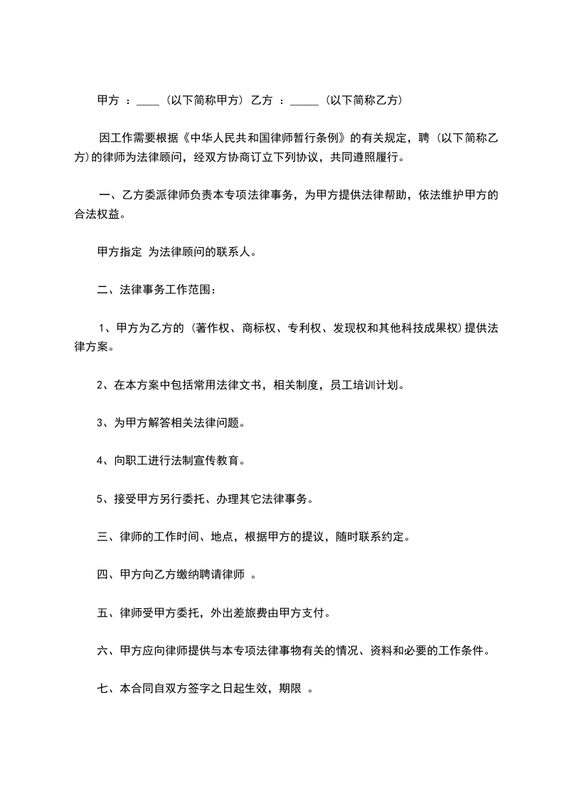 因工作需要根据《中华人民共和国律师暂行条例》的有关规定,聘 (以下简称乙方)的律师为法律顾问,经双方协商订立下列协议,共同遵照履行。