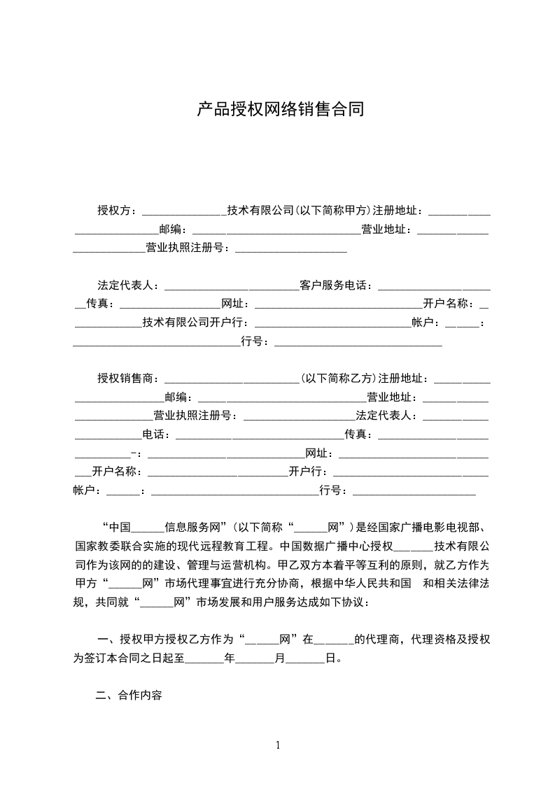 一、授权甲方授权乙方作为“______网”在_______的代理商,代理资格及授权为签订本合同之日起至_______年_______月_______日。