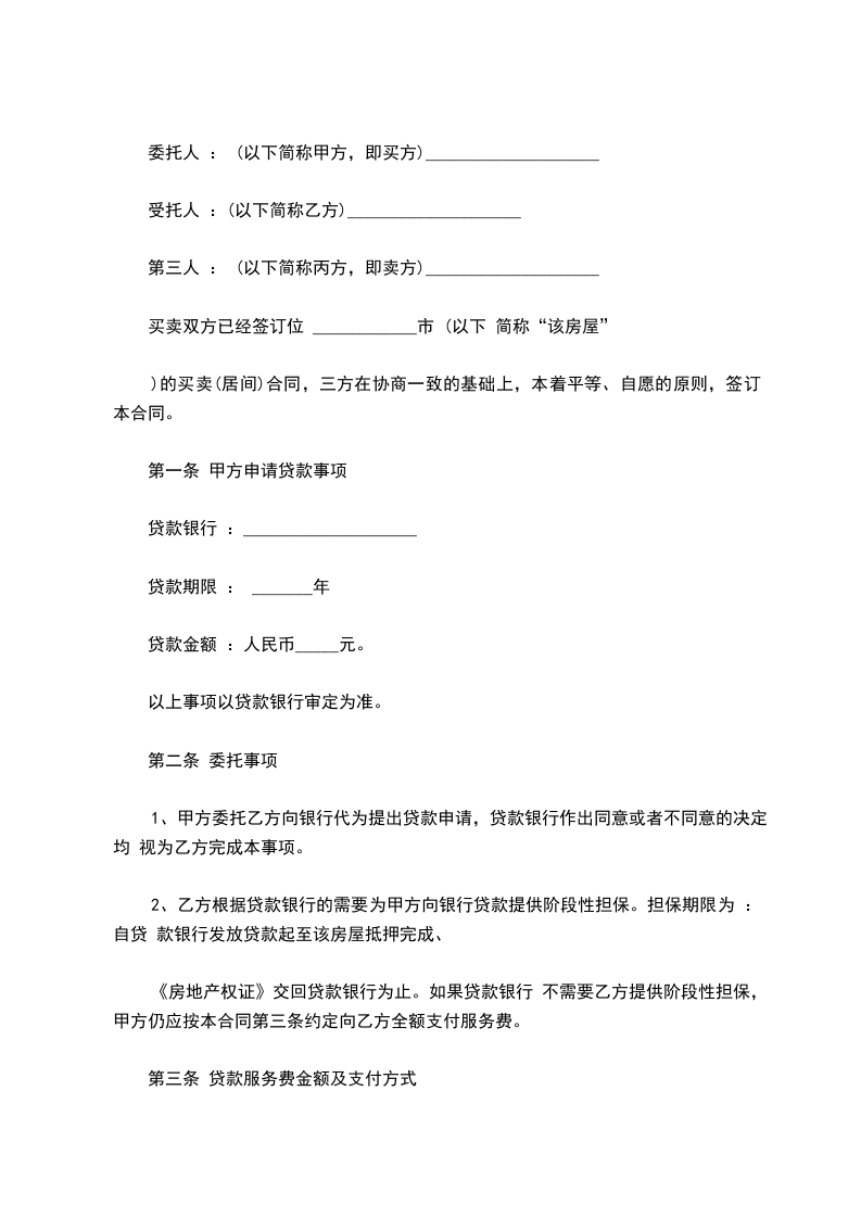 1、甲方委托乙方向银行代为提出贷款申请,贷款银行作出同意或者不同意的决定均 视为乙方完成本事项。