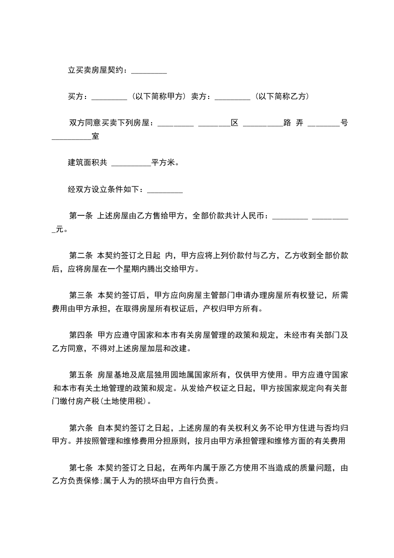 第一条 上述房屋由乙方售给甲方,全部价款共计人民币:_________元。