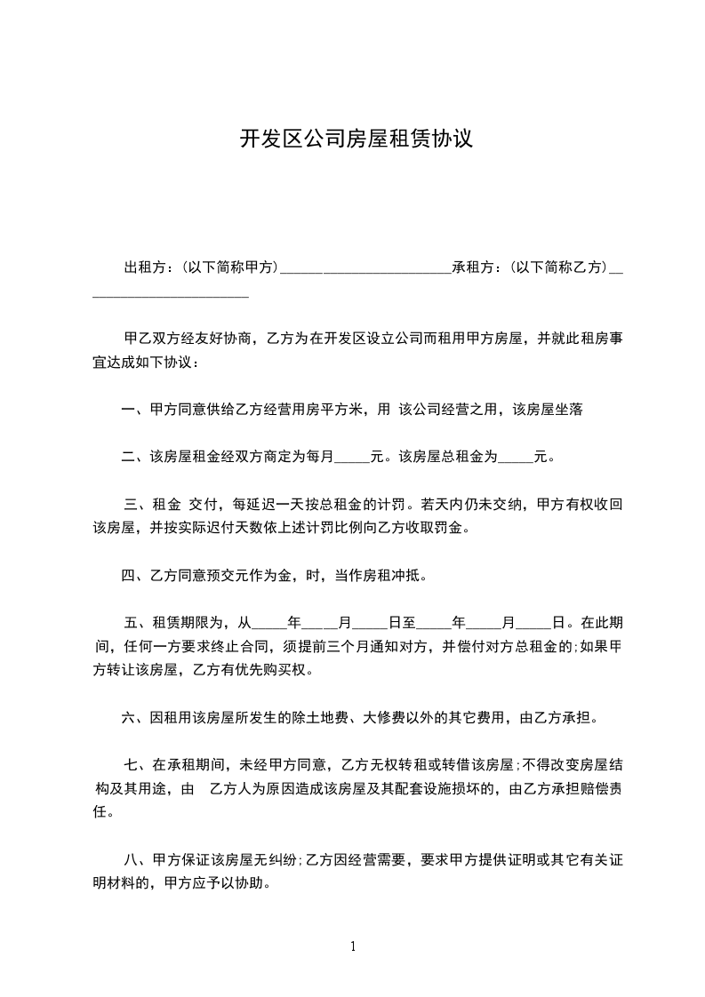 甲乙双方经友好协商,乙方为在开发区设立公司而租用甲方房屋,并就此租房事宜达成如下协议:
