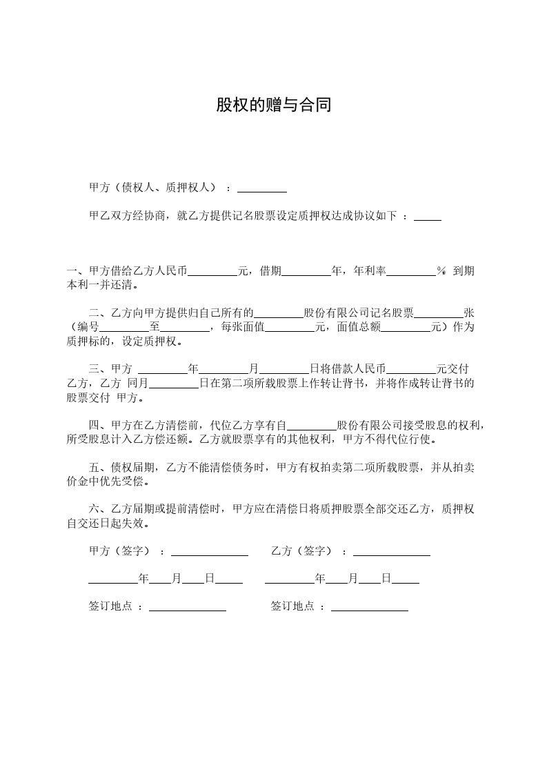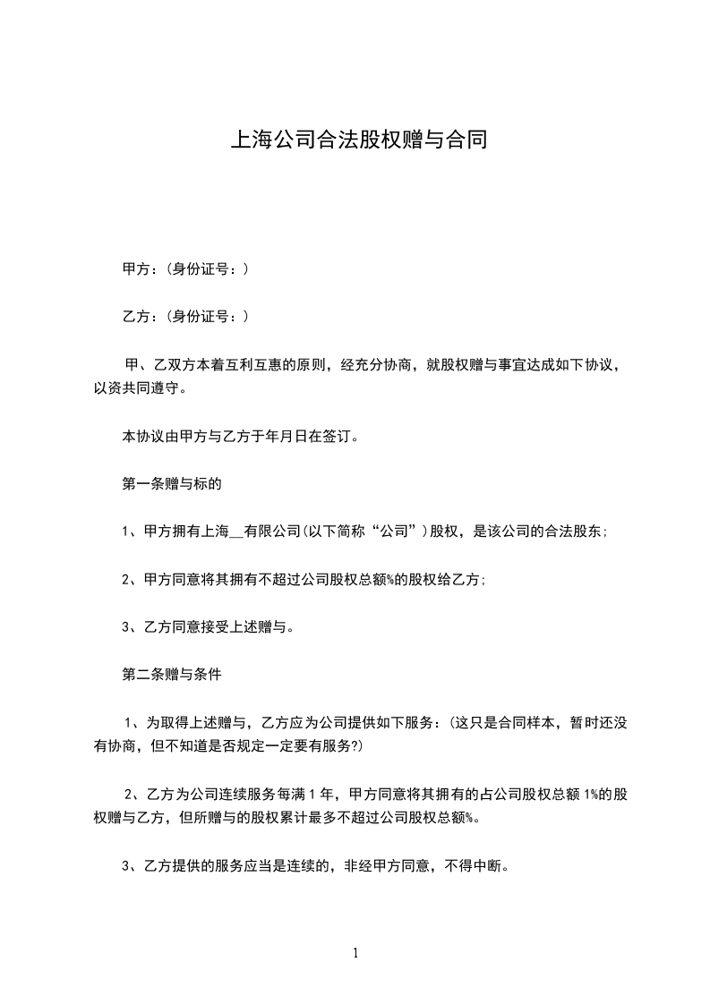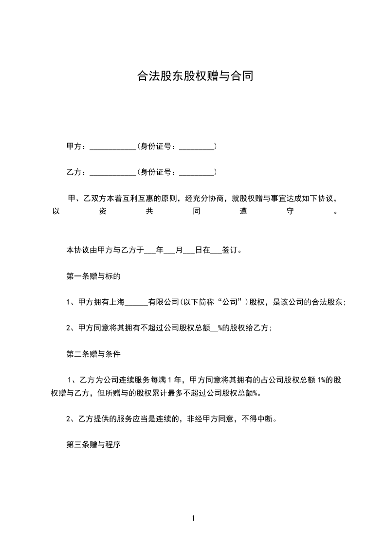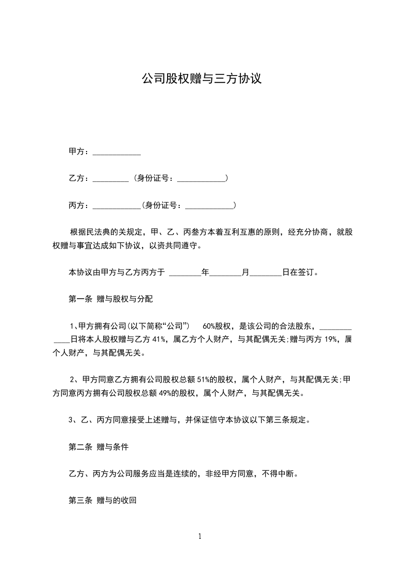 根据民法典的关规定,甲、乙、丙叁方本着互利互惠的原则,经充分协商,就股权赠与事宜达成如下协议,以资共同遵守。本协议由甲方与乙方丙方 _____年_____月_____日在签订。